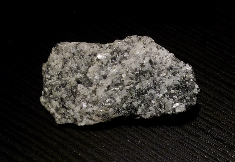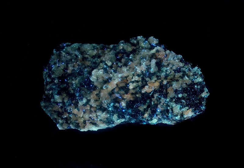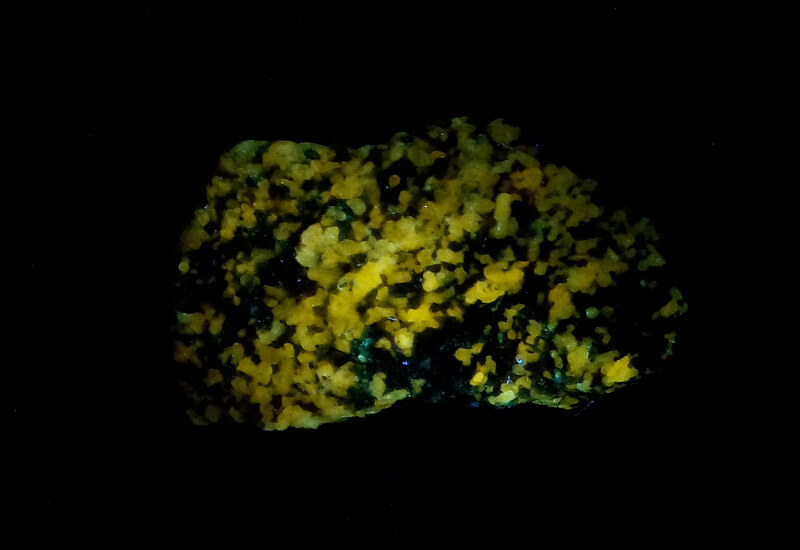 Wollastonite (white) with diopside (dark green) with (probably) minor calcite. The fluorescence is quite interesting: yellow/orange fluorescence under shortwave UV light, nothing with long wave, and yellow again with a 405nm blue laser. With the laser there is a red flash (typical for calcite); not sure if it is from the wollastonite or some underlying calcite, not really visible otherwise.