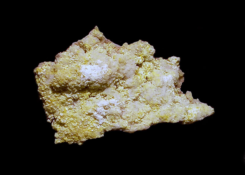 Many of the samples from this mine show a pale yellow mineral and a white material, both evaporites. The pale yellow (visible light) is bayleyite, as some specimens show the radiating needle-like crystal structure. Many specimens however, have been subjected to repeated bouts of solution and deposit, and have a lumpy, non crystalline appearance. At least some of the white material is calcium carbonate, which has formed a layer on top of the bayleyite. Some of the material could be rabbitite.