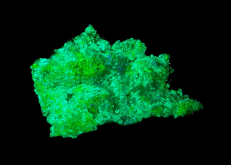 Bright green fluorescent under all wavelengths. Under short wave UV it is has a uniform green/blue color, while under long wave and 405nm laser there is a green/bluish background and some more yellowish “flowers”. I’m not sure which is the bayleyite, probably it is a mixture of secondary uranium minerals.