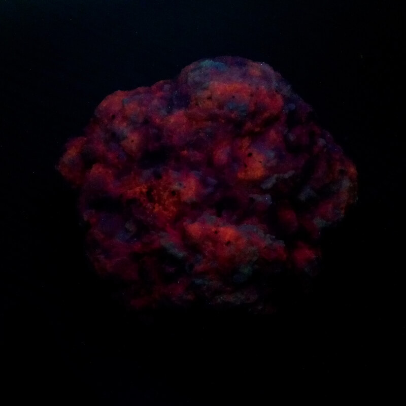 Druzy nosean (fluorescent orange under longwave UV light) on a matrix composed of sanidine (white opaque, fluorescent dark red under shortwave UV light) and orthoclase (white translucent, fluorescent bluish white under longwave UV light).