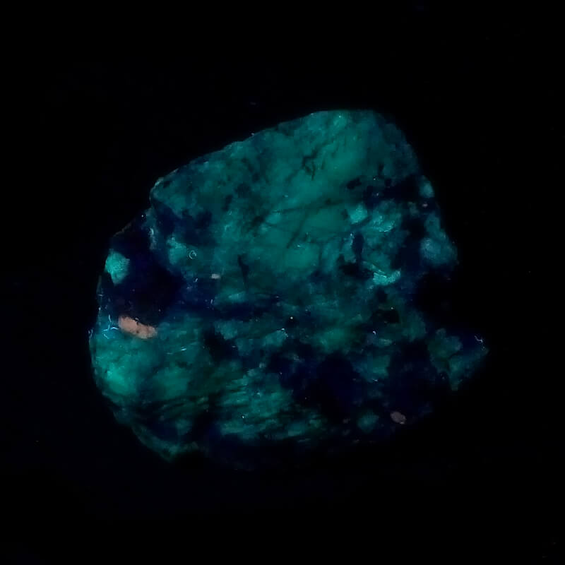 Amazonite. It looks like these samples are grey or only slightly green when they come out from the mine. Sunlight intensifies the green color (and the fluorescence?). The fluorescence is a bluish green only under shortwave UV light. No fluorescence under longwave.