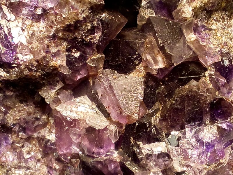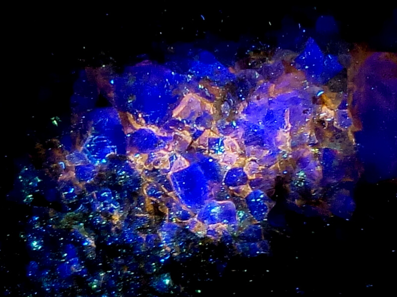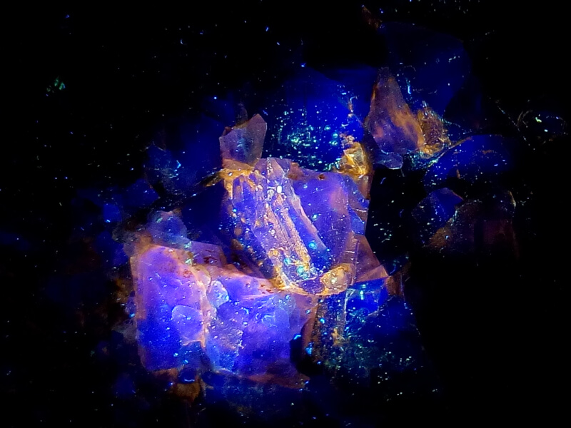 Fluorite crystals with small inclusions of sphalerite. The fluorite has the typical blue fluorescence, but at the base of most crystals there is nice yellow/orange fluorescence of the sphalerite. I’m not sure it is sphalerite, but I think it is the most probable suspect… The yellow fluorescence is quite weak,but clearly visible. If you know better about this locality let me know. The field of view in the macro 1 and 2 is about 2 and 1cm, respectively.