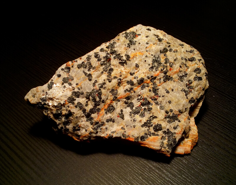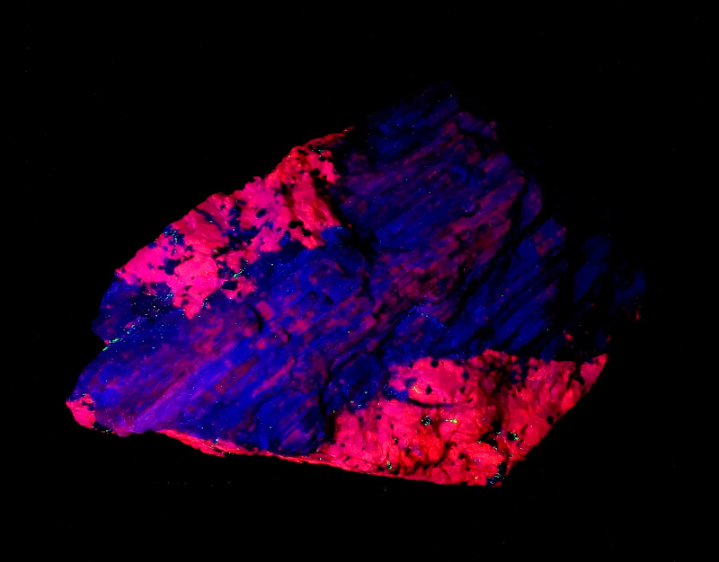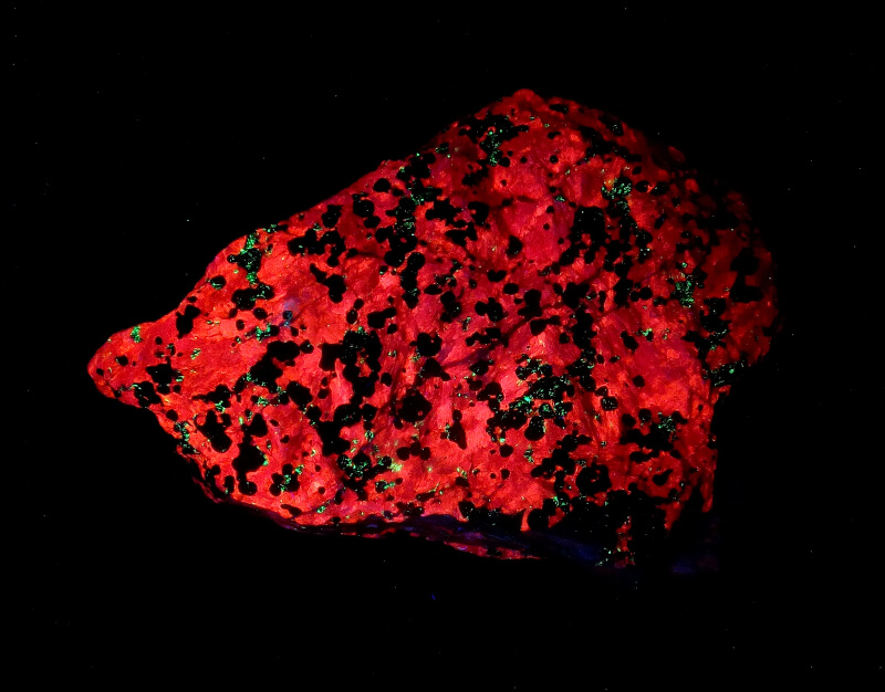 Calcozincite (orange) surrounded by calcite (white) with black dots of franklinite. The calcite fluoresces a bright red under shortwave UV light. The calcozincite (a mix of calcite, zincite and tremolite fibers) fluoresces a weaker zoned pink/white. The back size is covered by calcite and franklinite with a little willemite, which fluorescences bright green.