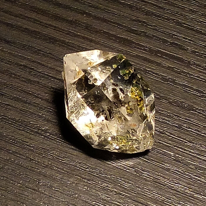 Double terminated petroleum quart. A nice little crystal with lots of yellow oil inclusions. Most are small and “solid”, one is larger, and contains a moving bubble (of what?). Under LW light, the solid inclusions fluoresce a very bright blue, while the larger one has a more yellowish tint (in the photo it is the white/oversaturated blob). The fluorescence spectrum shows a lot of superimposed peaks in the blue region (400-500nm), with the maximum of emission in the green region (500-550nm).