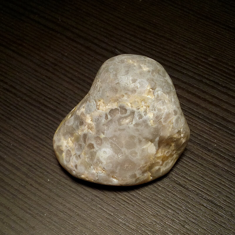 This was collected in northern Milwaukee county along the beach at night. The exact location is not known but it may have been north of the Schlitz Audubon nature center. I’ve been told these chalcedony nodules are fairly common and have varying degrees of fluorescence, most are a dull yellow tan to a dull orange in color and some show no fluorescence. The element/mineral that causes the fluorescence is not known, but it could be carbonate. On the lake Michigan beaches you can find chalcedony after carbonate pseudomorph of Favosites and Halysites corals and, though this one is not an obvious former fossil, it does have some interesting patterns/structure that make it a possibility. The fluorescent spectrum under 365nm LED shows a broad, composite band centered at about 570nm. Not sure about the activator… Probably carbonates and organic compounds.
