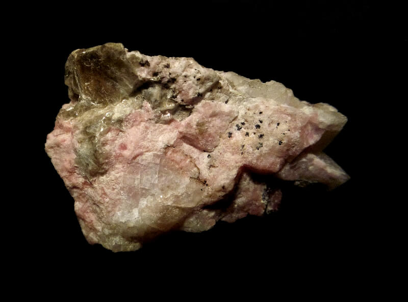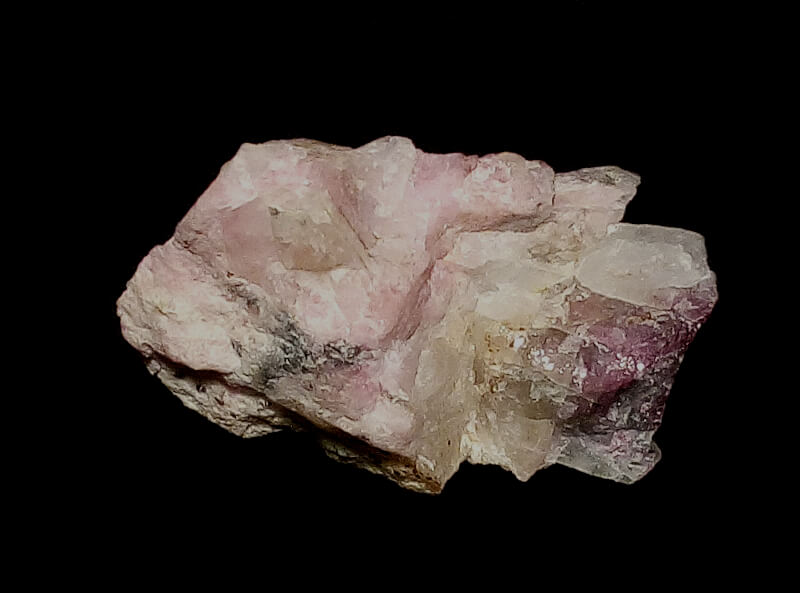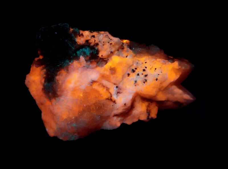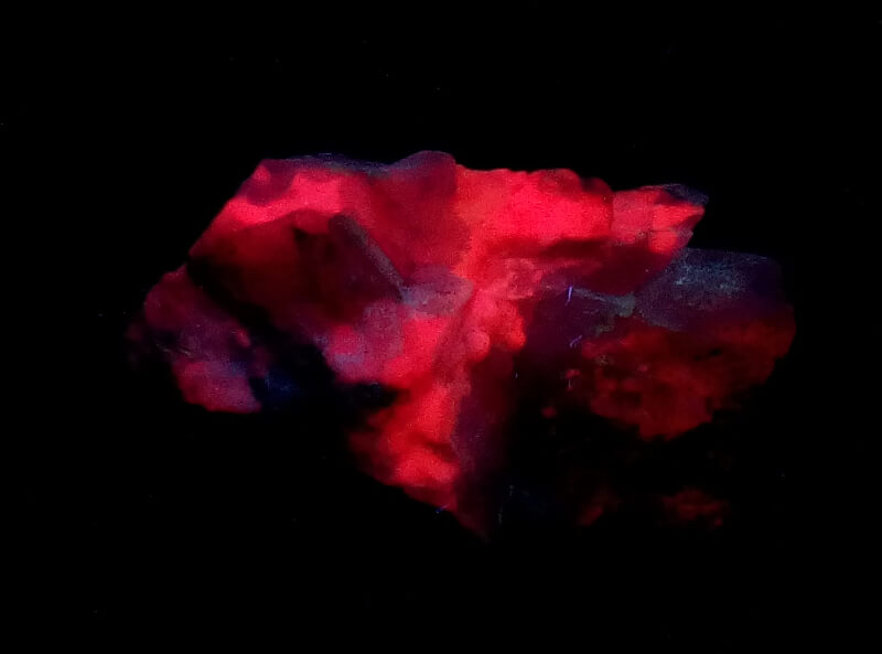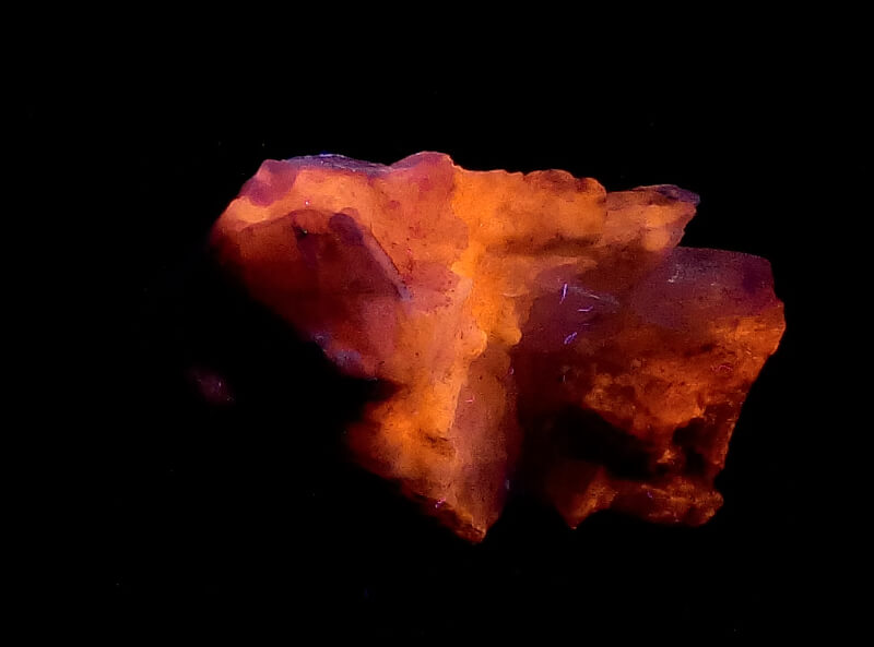 Tugtupite, Polylithionite, Sodalite et al. from the Taseq Slope, Greenland. The “matrix” is mostly tugtupite (tenebrescent pink) and fluorescent red and orange under shortwave and longwave UV light, respectively. Phosphorescent white under both shortwave and longwave. The top left in the first side is polylithionite, fluorescent yellow/green under shortwave, nothing under longwave. Between the polylithionite and the tugtupite there is a little unknown, fluorescent white/blue(?) mostly under longwave and phosphorescent whitish. The second side is again mostly tugtupite. The bottom right corner is blue/grey, tenebrescent dark red, not much fluorescent under shortwave, and strong orange under longwave. No phosphorescence. I guess it is blue sodalite? The crystal on top of the sodalite is not fluorescent. Don’t know what it is. On the back of the sodalite there is something fluorescing white/blue under shortwave (no photo). The label says there is tugtupite, chkalovite, albite, polylithionite, neptunite, pyrochlore, aegirine, sodalite.