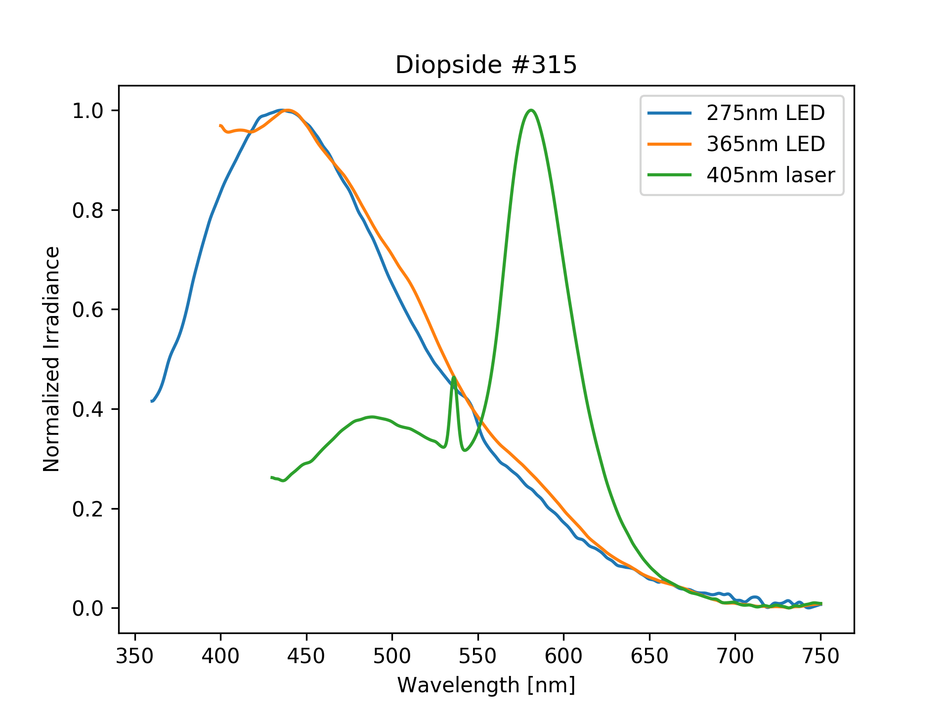 Big chunk of diopside. Nice blue fluorescence under shortwave UV light. Under longwave UV light the color is a more yellowish, and even more with a 405nm blue laser. It looks like there is a orange/red flash phosphorescence. I collected three fluorescence spectra under 275nm LED, 365nm LED and 405nm blue laser. The first and second ones show a broad peak at about 435/440 nm. This should be due to nTiO6 groups. It looks like the spectrum under 365nm LED is composite with more hidden peaks at about 470nm, 500nm and 580nm. The spectrum under 405nm blue laser is very different. The main peak is now at 580nm, due to Mn2+ replacing Ca2+ and there is a broad peak at about 490nm. I don’t know what is the activator for this second peak. (The sharp peak at 536nm is leaking from the blue laser).