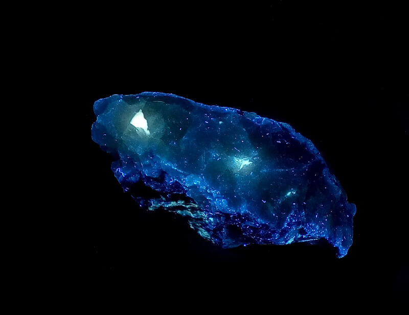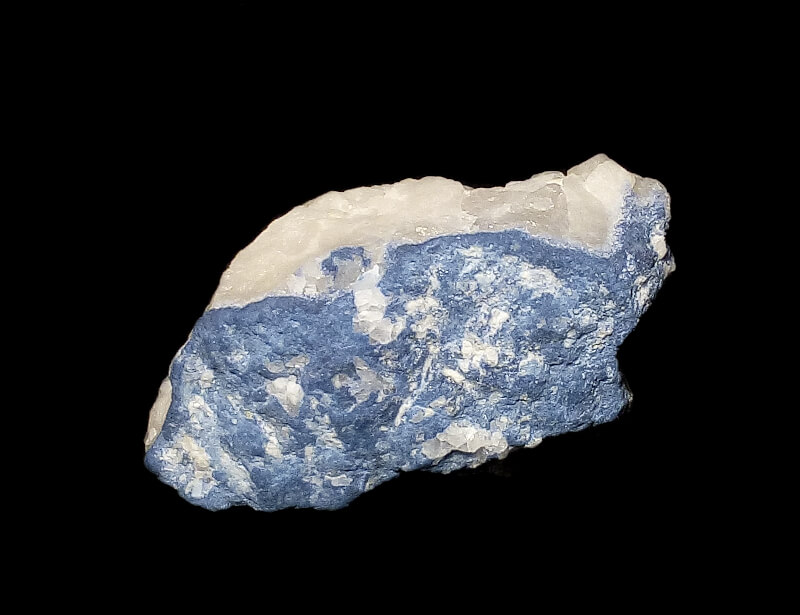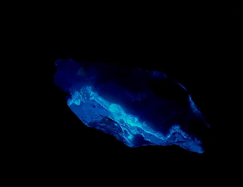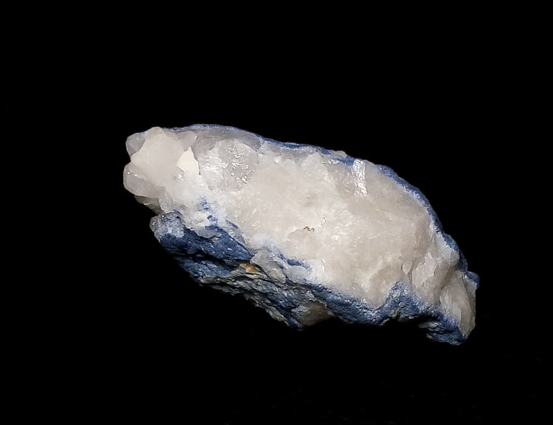 Blue dumortierite on quartz. The dumortierite fluoresces a nice blue under shortwave UV light. In the quatz, there is soft, white mineral, fluorescent bright white under longwave UV light, possibly dickite.