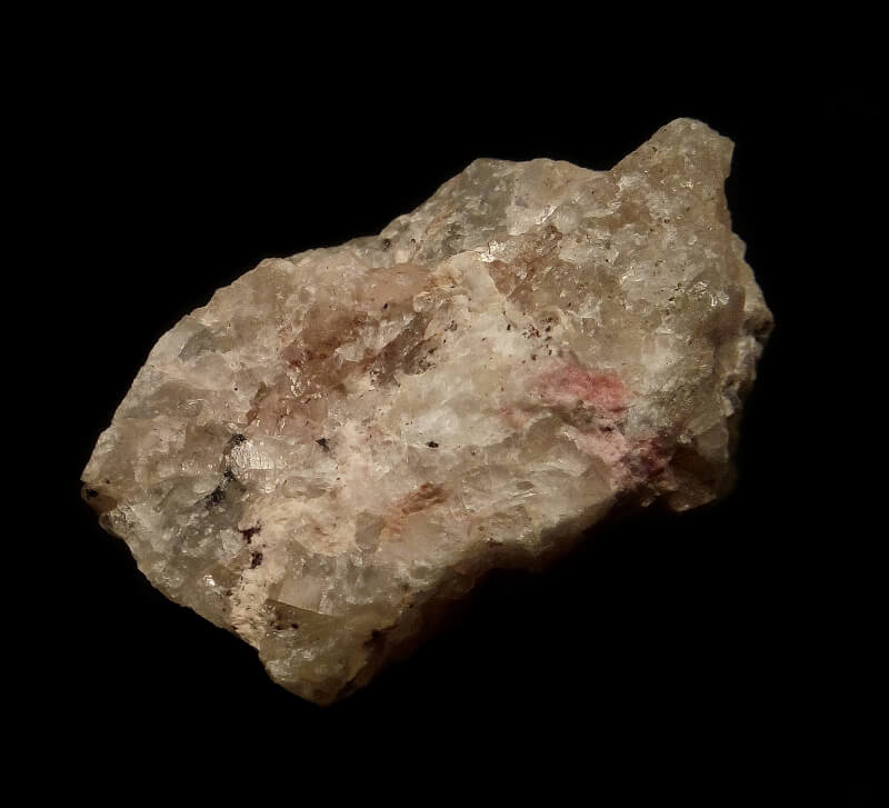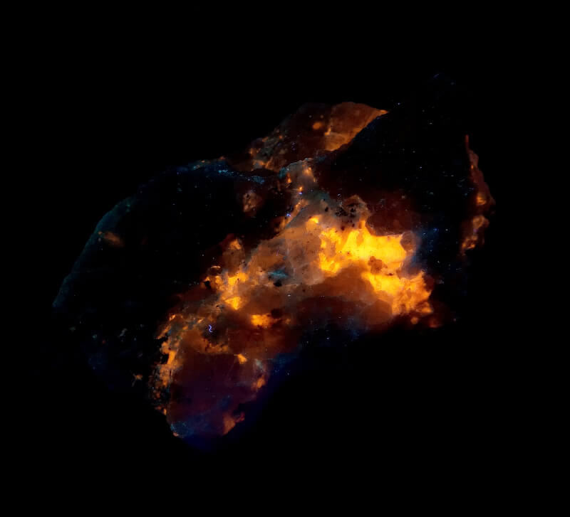 The rare mineral sorensenite associated with tugtupite. Best is under shortwave UV light: the sorensenite fluoresces a nice white, while the tugtupite fluoresces bright red. Under longwave UV light there is a lot of orange fluorescence from the tugtupite (and possibly sodalite in the matrix?). The tugtupite is also slightly tenebrescent: it saturates to a slight pink color under exposure to UV light (will bleach to white under artificial white light).