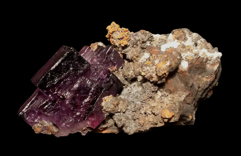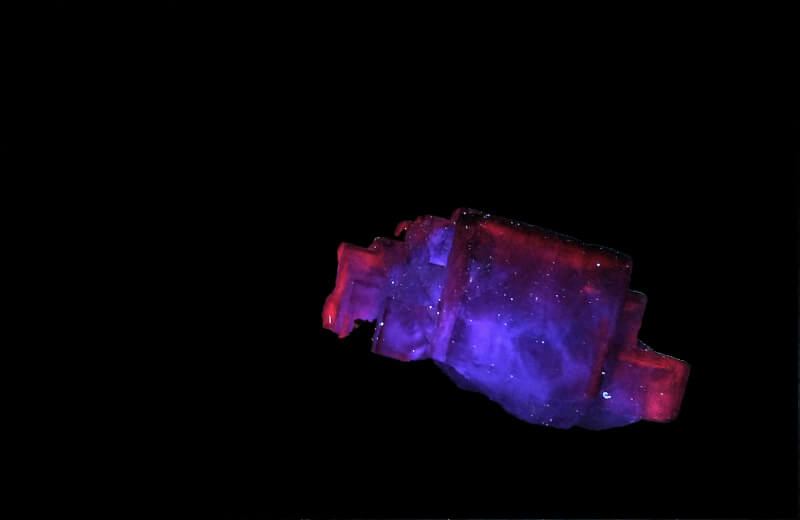 Cubic fluorite crystals on matrix. Fluorescent red and blue under longwave UV light.