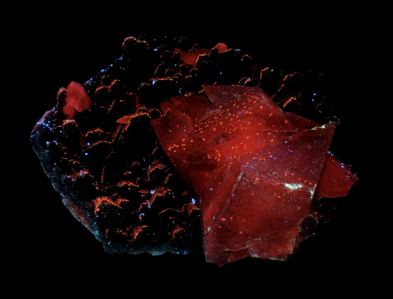 Calcite in a bed of quartz. The calcite fluoresces a nice red under shortwave UV light. Under longwave UV light, the red fluorescence of the calcite is weaker, but some dark inclusions in the calcite fluoresce orange. The inclusions could be sphalerite.