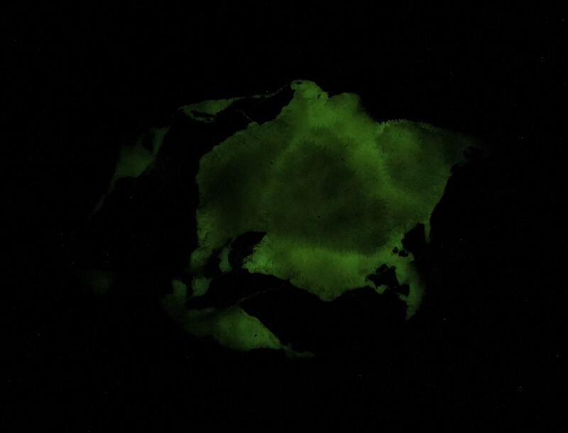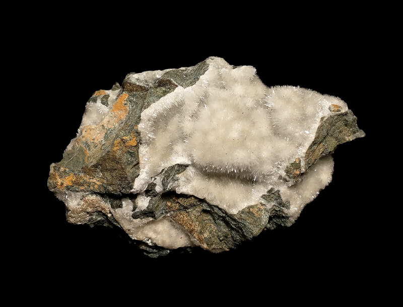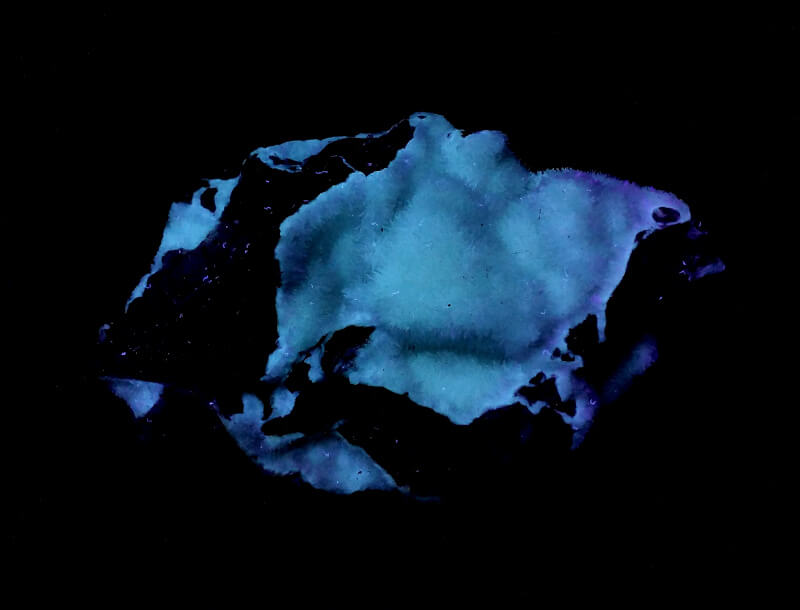 Acicular aragonite crystals. Bluish/white fluorescence under UV light with green phosphorescence/afterglow.