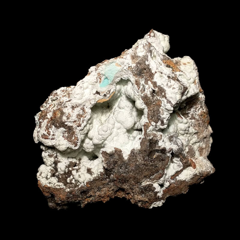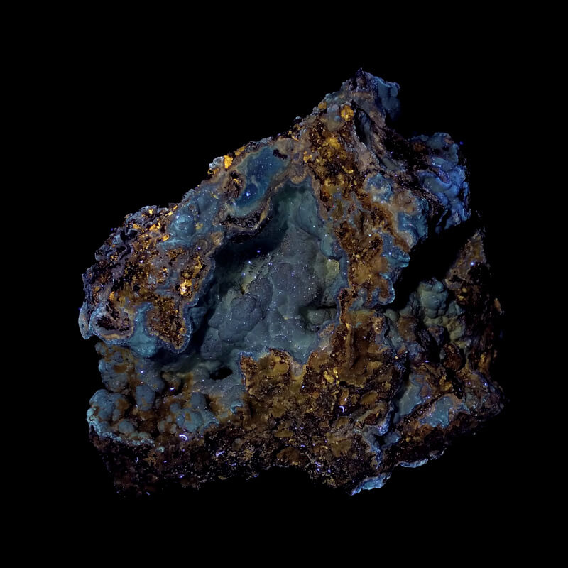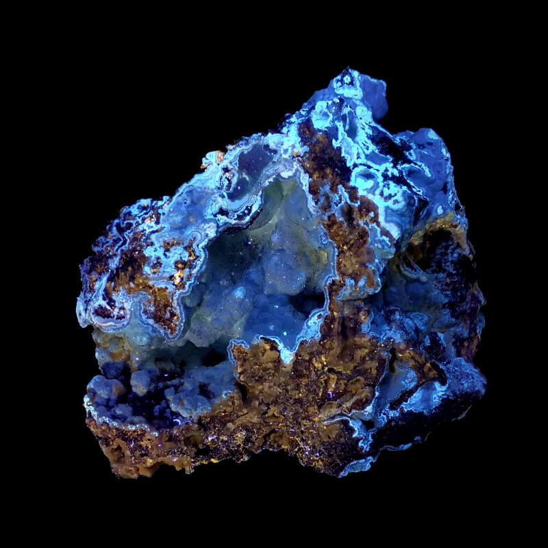 Hydrozoncite on matrix. The hydrozincite fluoresces a nice blue under shortwave UV light, not much under longwave. The matrix has a weak brown/orange fluorescence under longwave, I don’t know what it is.