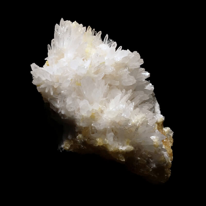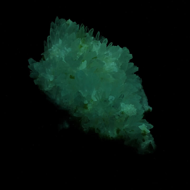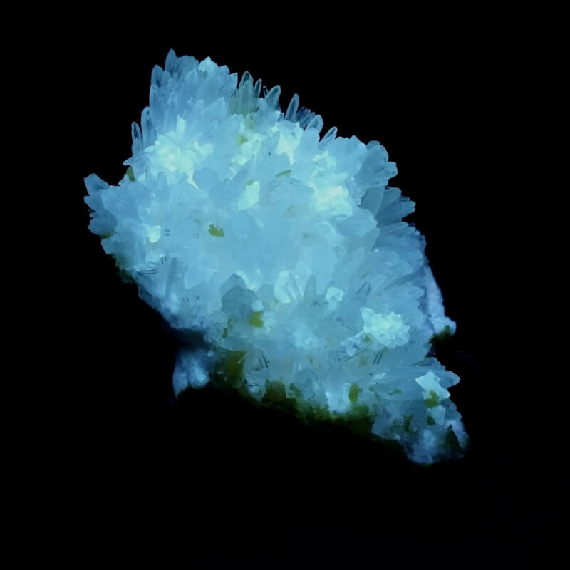 Clear white celestine crystals (about 1cm) with sulphur on matrix. The celestine fluoresces a nice blue/white under UV light (any wavelength) and it has a greenish phosphorescence/afterglow.