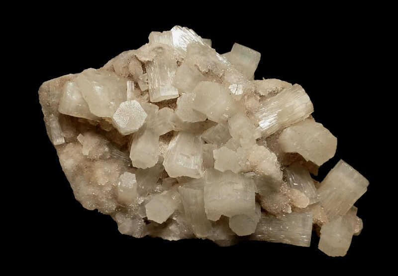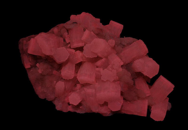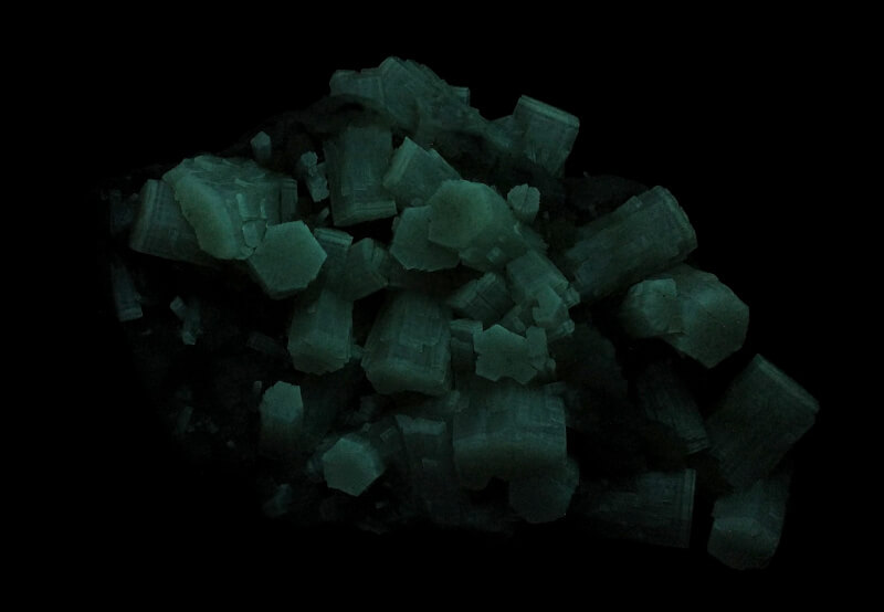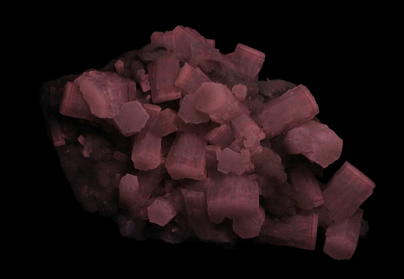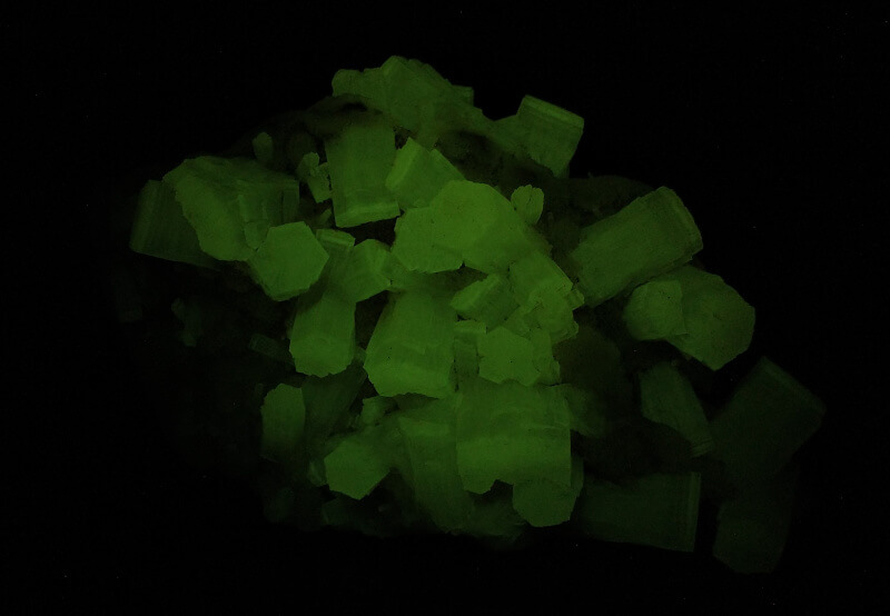 Prismatic aragonite crystals on matrix. Nice fluorescence under all wavelengths: from pink under shortwave UV light to red under longwave. Strong greenish phosphorescence/afterglow after exposure to UV light.