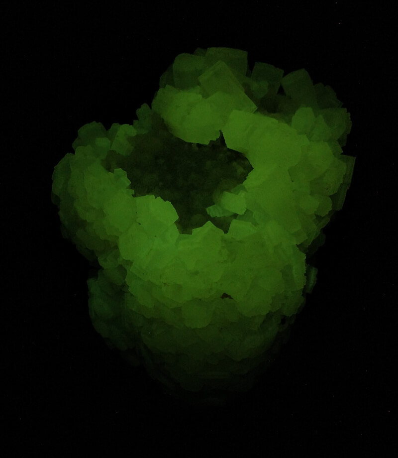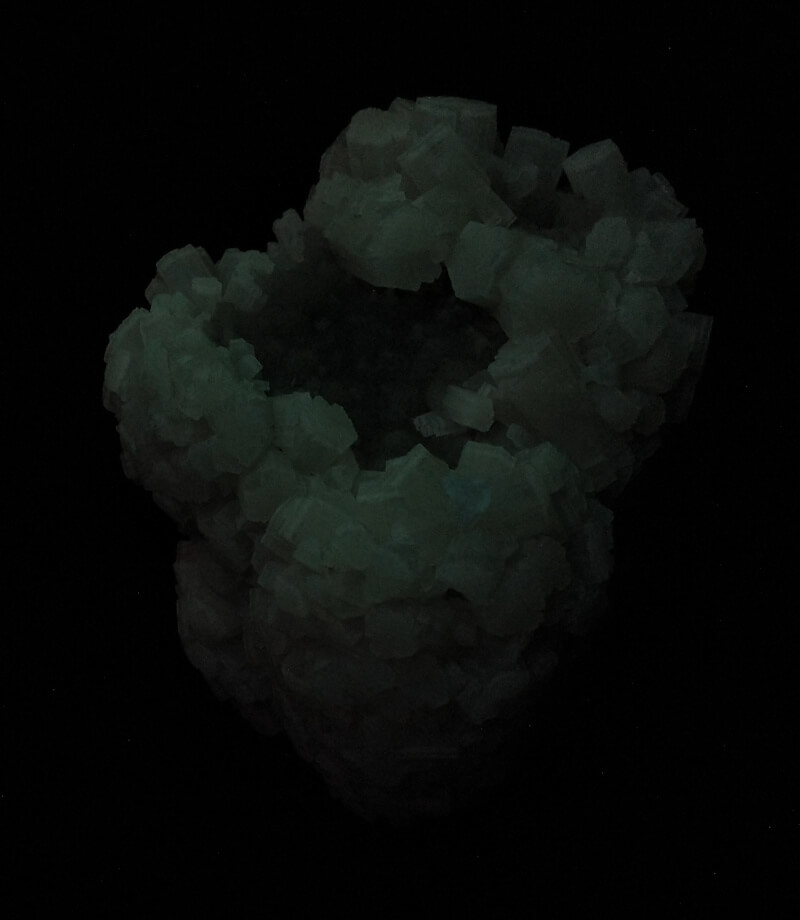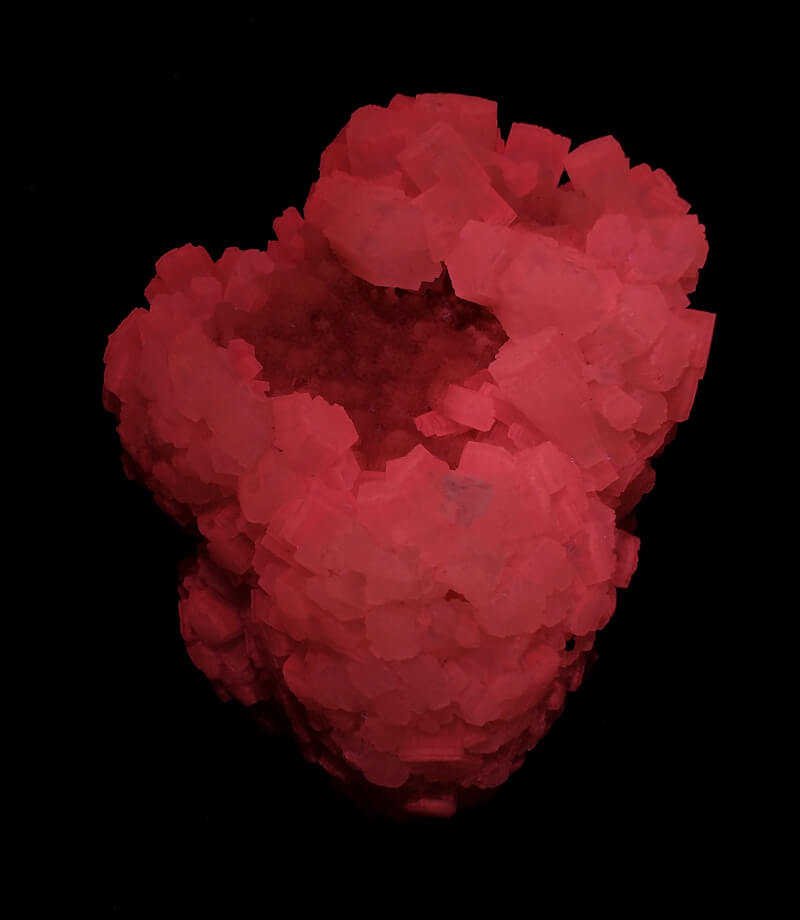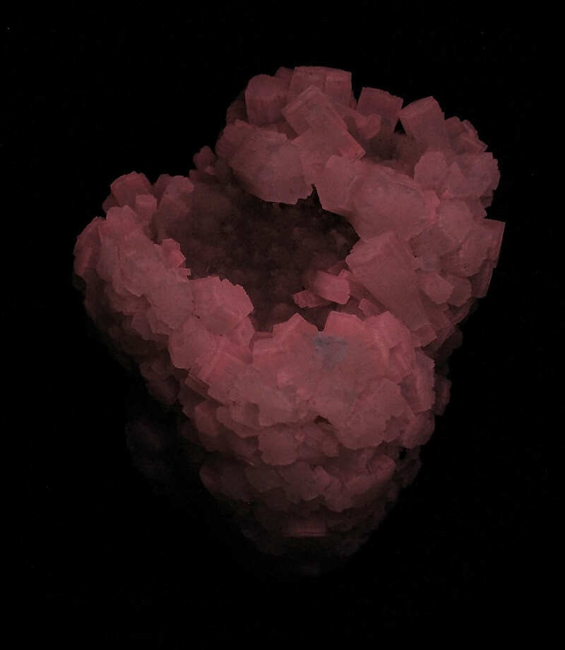 Compact prismatic aragonite crystals on matrix. Nice fluorescence under all wavelengths: from pink under shortwave UV light to red under longwave. Strong greenish phosphorescence/afterglow after exposure to UV light.