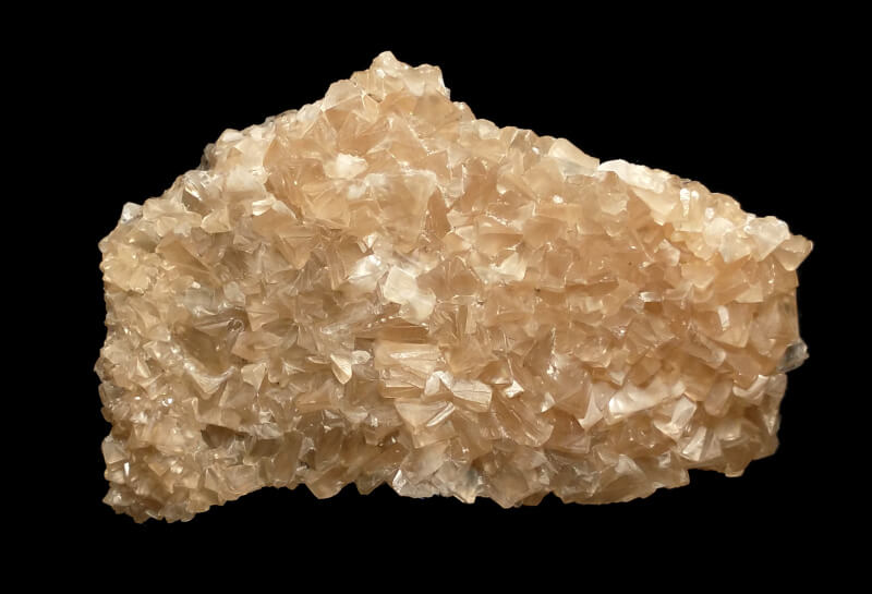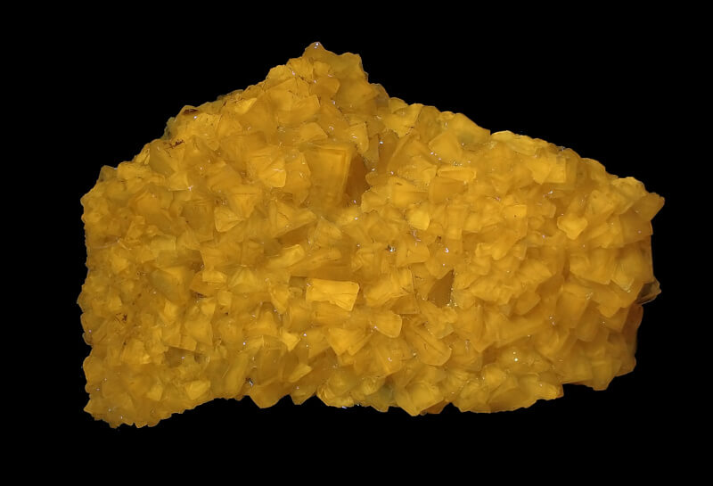 Compact calcite crystals. Zoned yellow/green fluorescence under shortwave UV light, honey under longwave UV light.