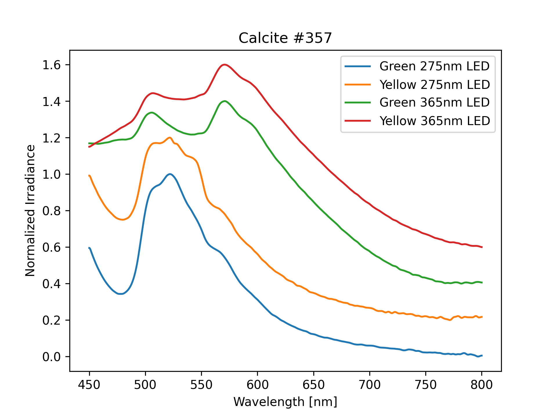 Photo in normal light.Fluorescence under shortwave UV light (254nm Hg light).Fluorescence under longwave UV light (365nm LED). Fluorescence spectra under UVC (275nm LED) and UVA (365nm LED) measured for the crystals that best fluoresce yellow and green under UVC. The spectra show composite emissions due to multiple activators, hard to speculate which ones. Both UVA and UVC fluorescence have a complex peak between 500nm and 550nm. Under UVC this first peak has an undulating appearance, which could indicate uranyl emission. A second main peak at around 570nm is only present under UVA and could be due to manganese activation. Not shown in this figure is an intense fluorescence peak at ~350nm, which should be assigned to cerium fluorescence (which could act as coactivator for manganese fluorescence). Last update: 07 May 2021