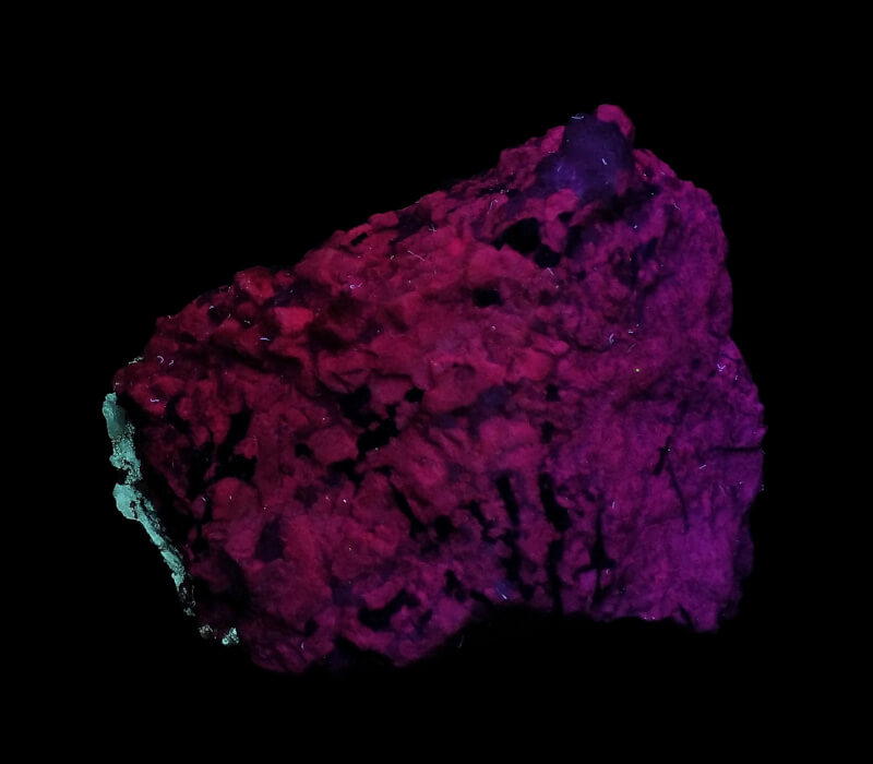 Chunk of microcline and albite matrix with small crystals. On the side, there is a little zektzerite. The albite/microcline fluoresces red under shortwave UV light, the zektzerite blue.