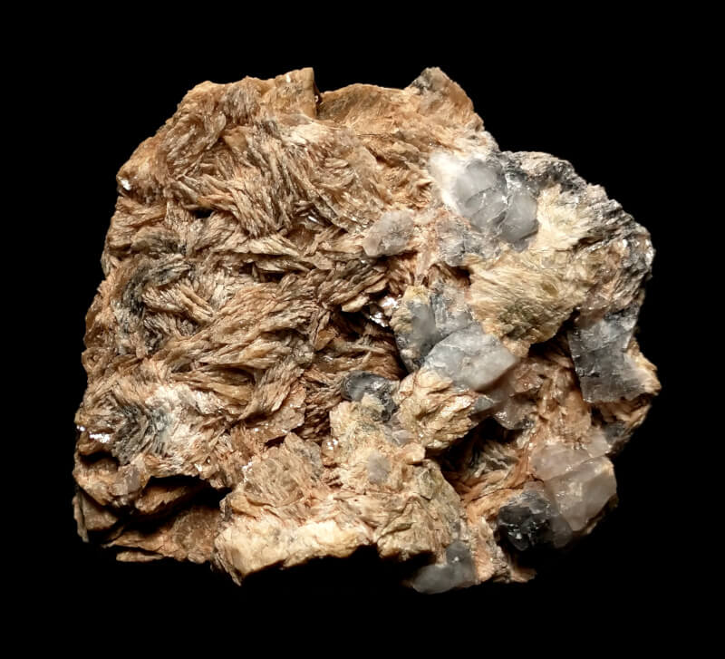Plate of bladed axinite crystals, most likely axinite-(Mn). Fluorescent red/orange under longwave UV light.