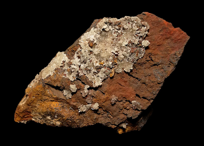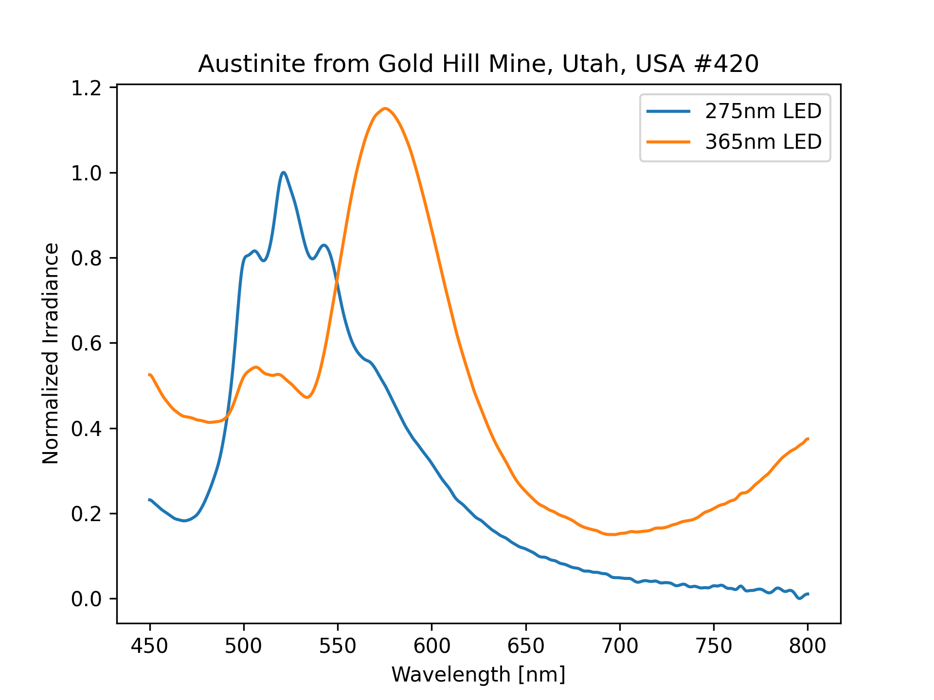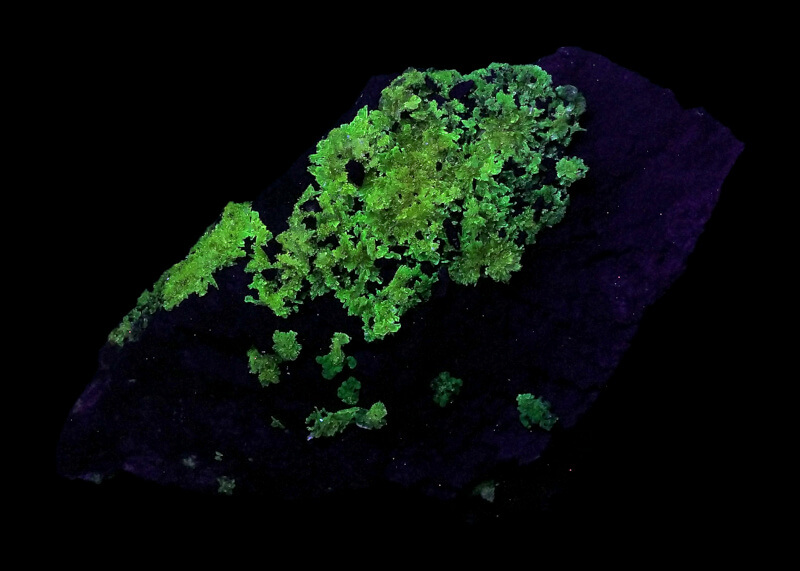 Austinite crystals on limonite (?) matrix from the type locality, the Gold Hill Mine in Tooele Co., Utah, USA, on the 80 foot level. Under longwave UV light it fluoresces a nice yellow, due to, I think, manganese. Under shortwave instead it fluoresces green, typical of uranyl fluorescence.