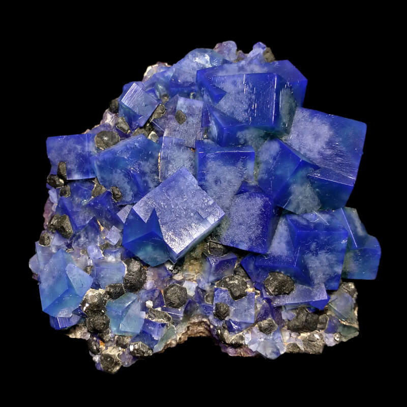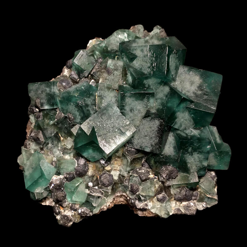 Green, lightly frosted, fluorite cubes up to 14mm by side with a little accompanying black galena. The fluorite is very strongly fluorescent blue under any kind of UV light. Even the sunlight has enough UV to show the blue fluorescence. From the Bluebirds Pocket at the Rogerley Mine, Weardale, UK. Collected between 2013 and 2015.