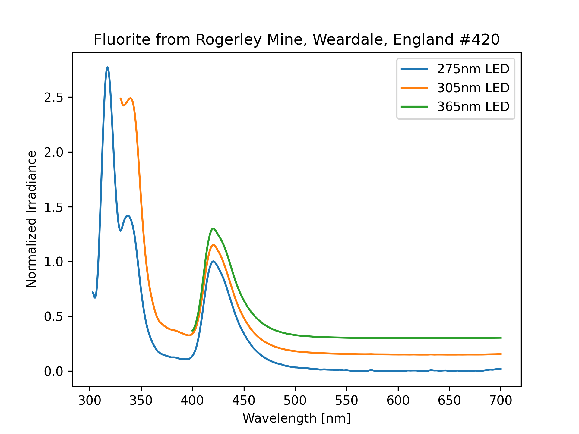 From the fluorescence spectra, the blue fluorescence is due to europium (peak at 420nm), with a couple of peaks in the UVB (317nm and 337nm), possibly due to cerium.