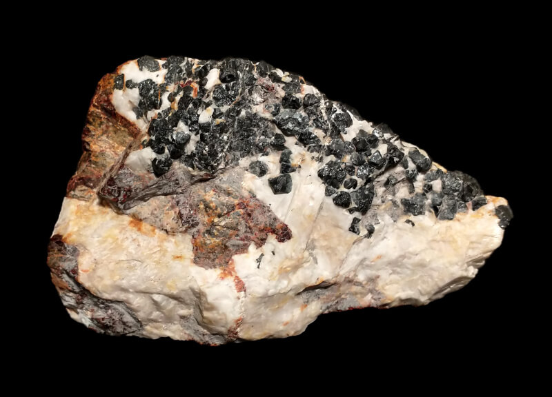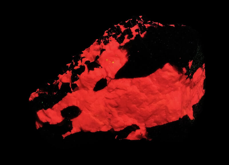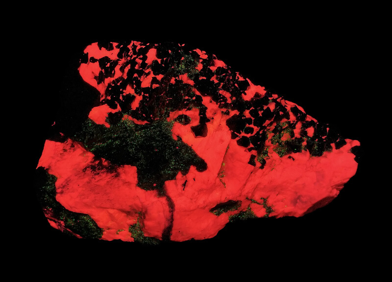 White calcite and red zincite, with good sized black franklinite crystals up to 7mm. On the back side some of the zincite is covered by willemite dust. Under shortwave UV light the calcite and willemite fluoresce the typical red and green.