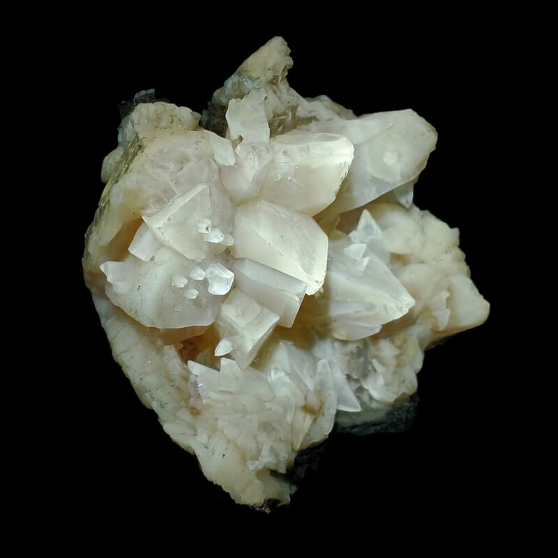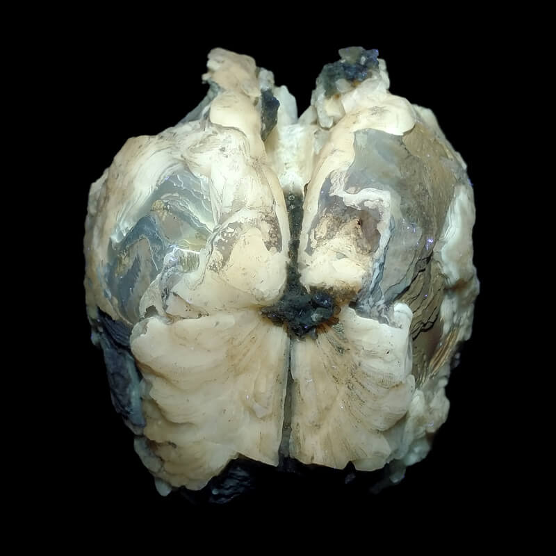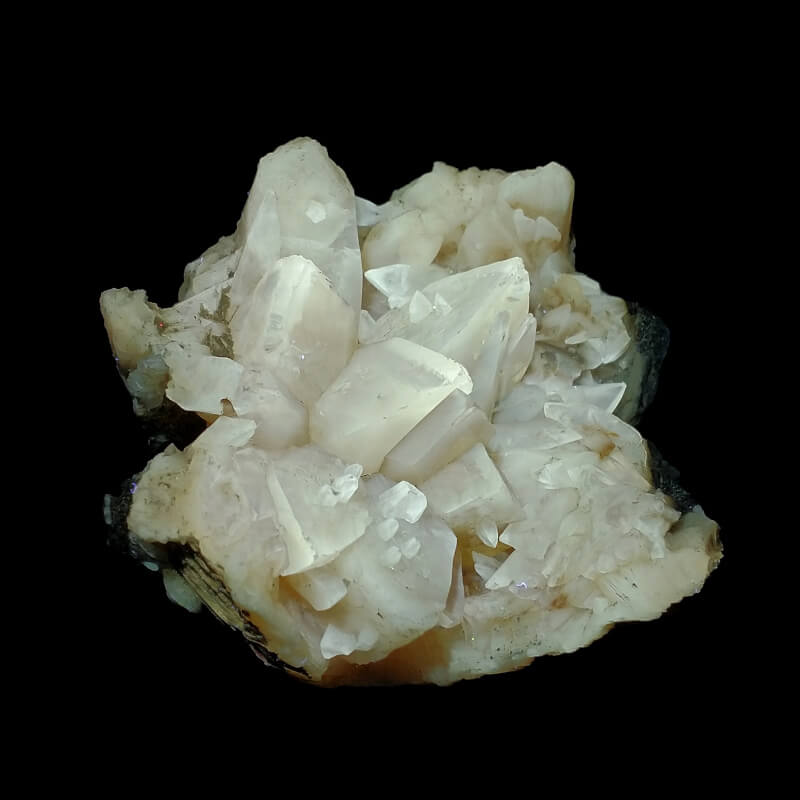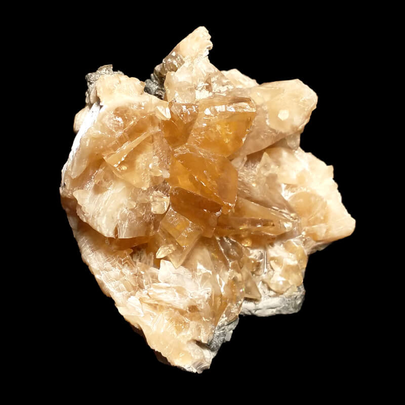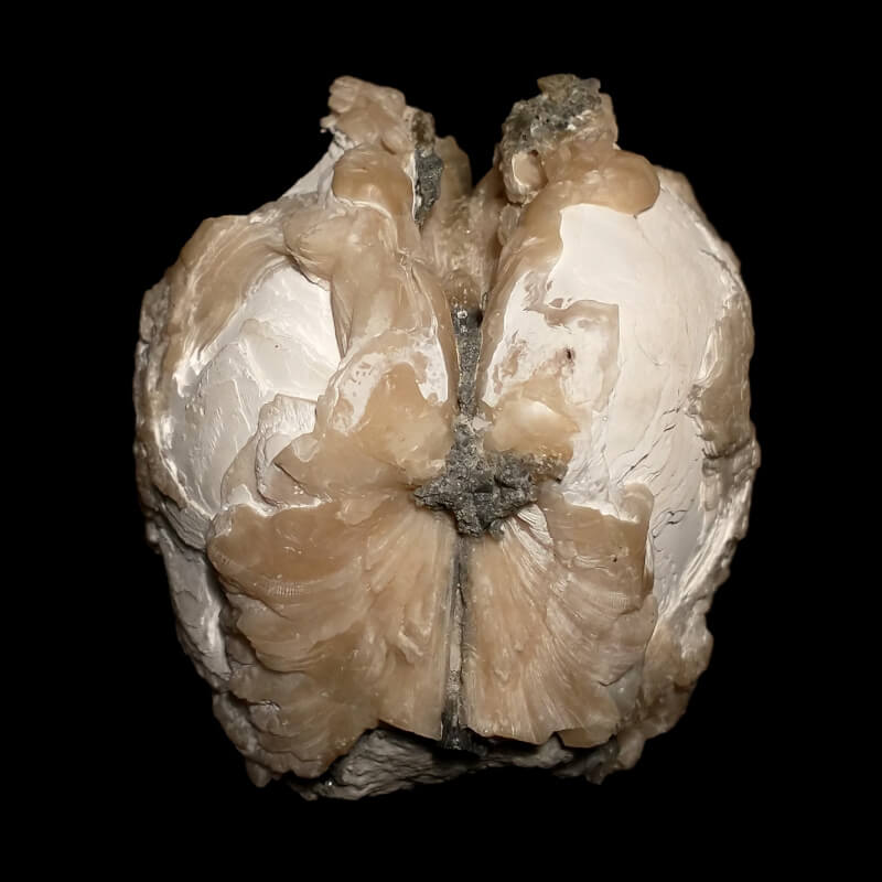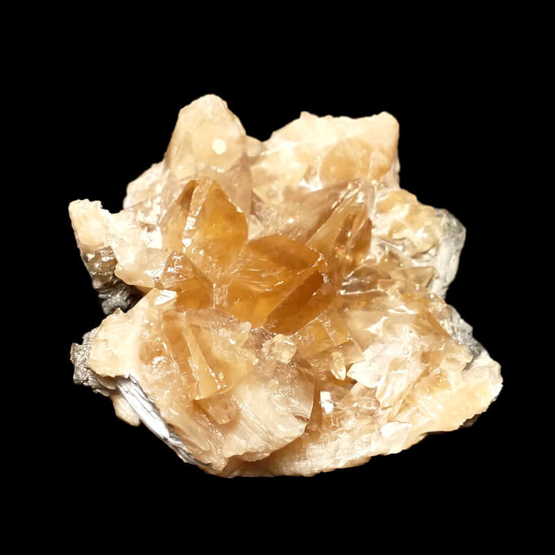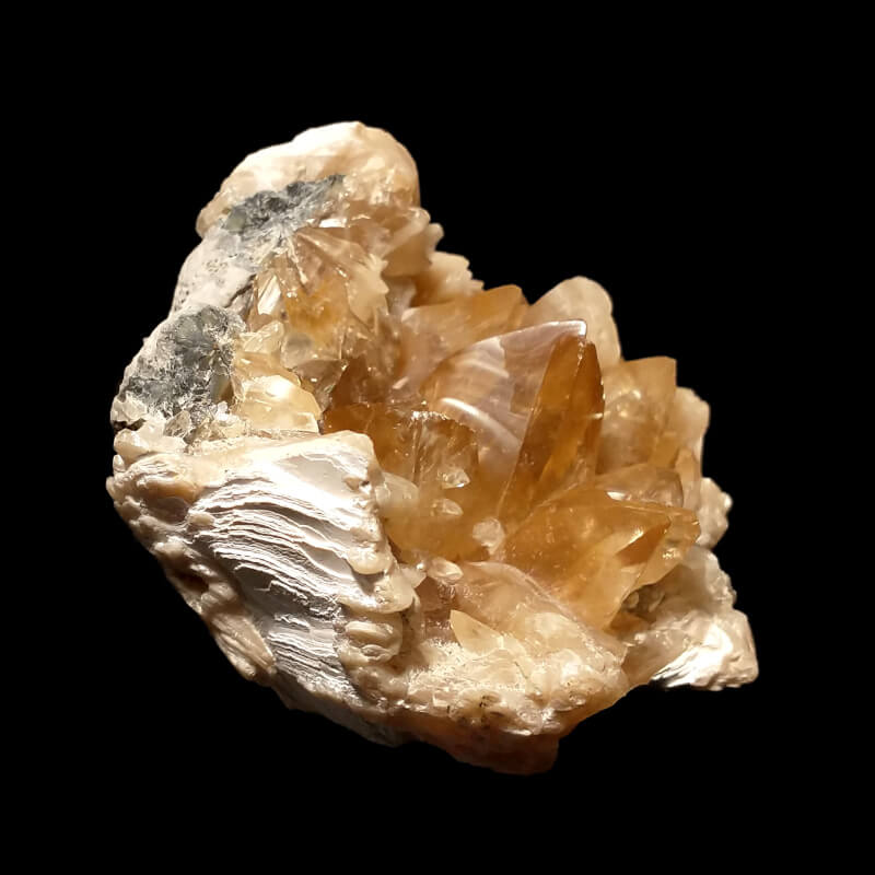 Honey colored calcite crystals grown inside a fossil clam shell. Very nice white fluorescence under UV light, with long lasting phosphorescence/afterglow.