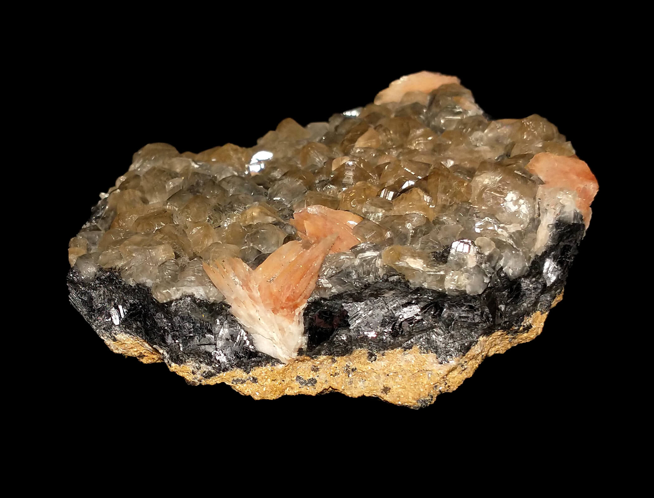 Plate of cerussite crystals growing over a thick galena layer, with a little baryte. The cerussite fluoresces yellow under UV light. The last photo shows the layering: the galena on matrix, the baryte from the matrix crossing the galena, and the cerussite on top of the galena.