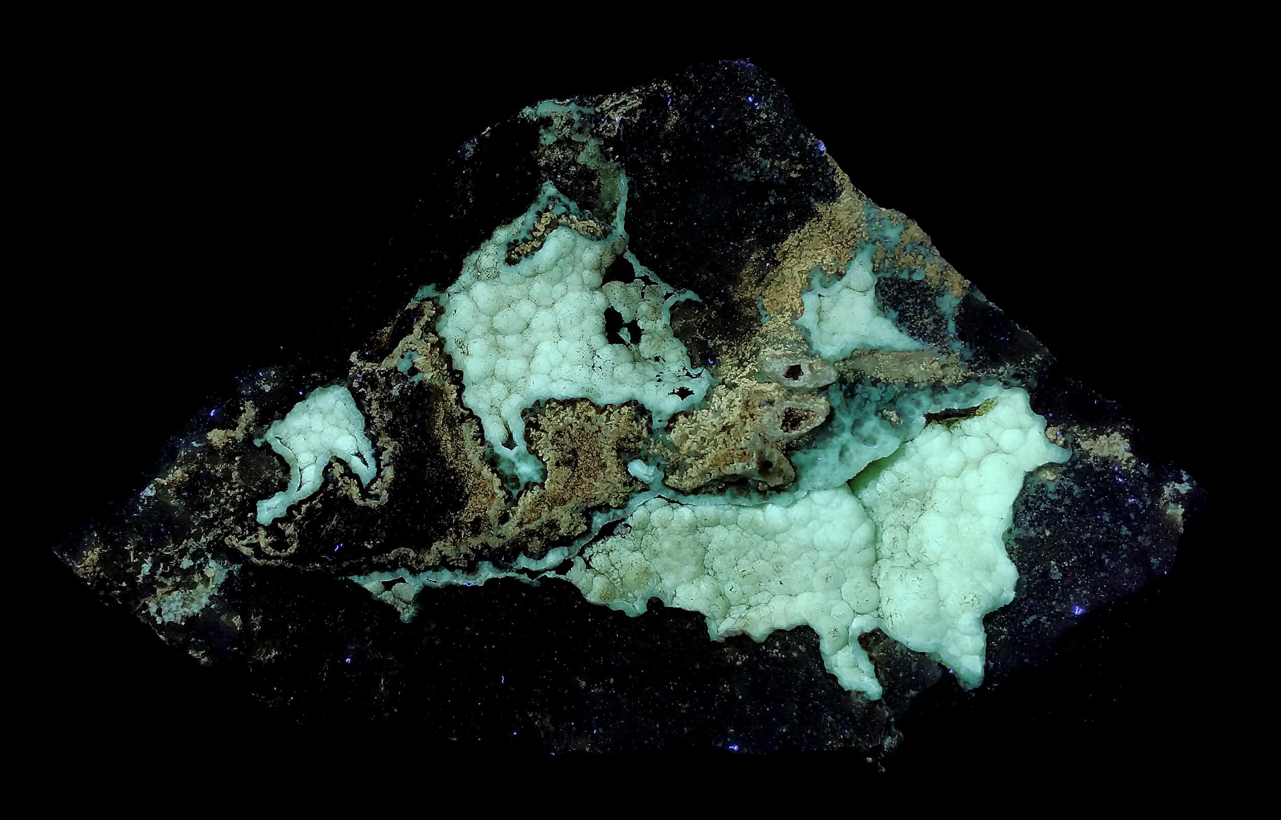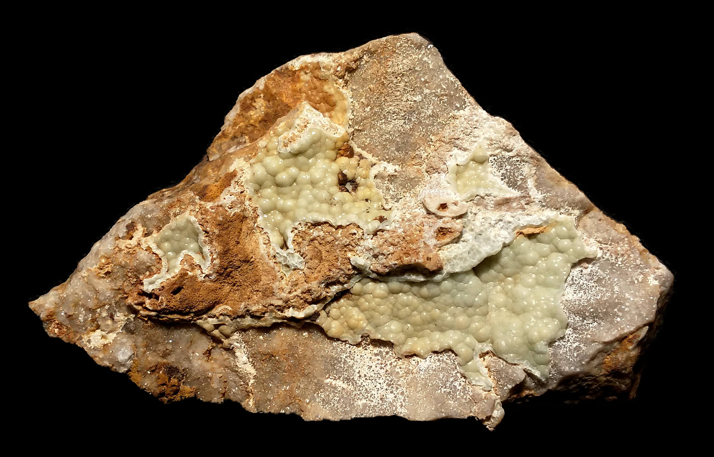 Spheroids of variscite and wavellite on quartzite matrix. The variscite/wavellite fluoresces white/green under UV light, with greenish phosphorescence/afterglow.