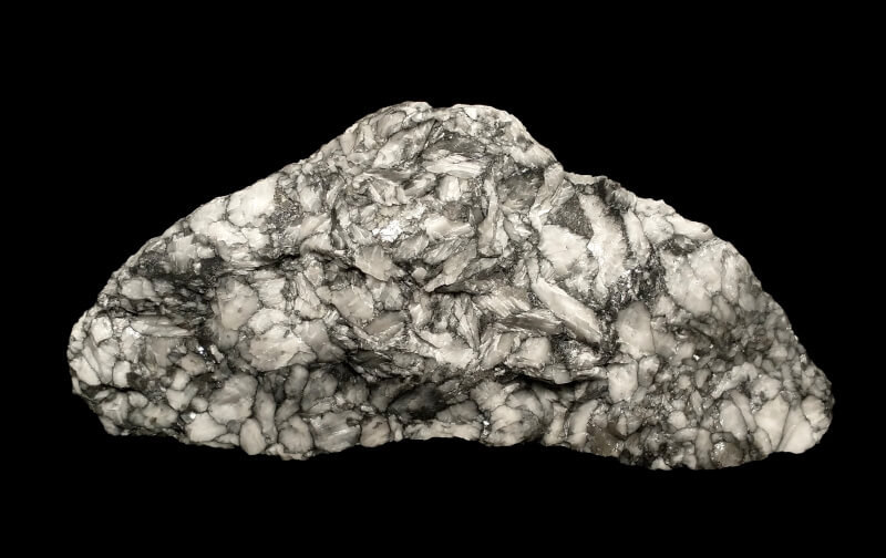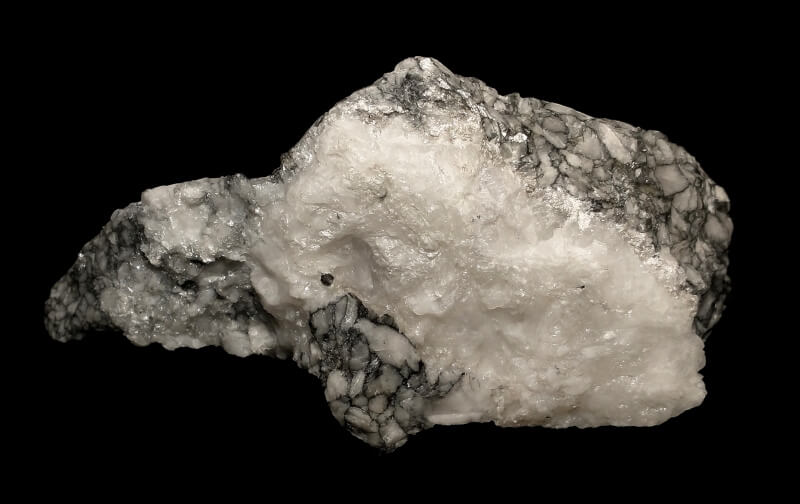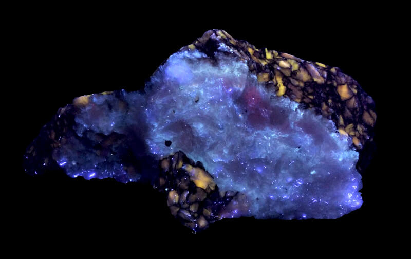 Pinolite, a rock formed by white magnesite grains in a black matrix of dolomite and graphite. The magnesite fluoresces yellow with interesting patterns under longwave UV light. On the back there is a vein of calcite which shows a little red fluorescence.