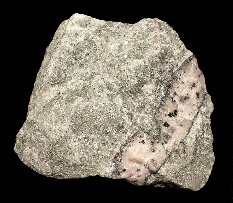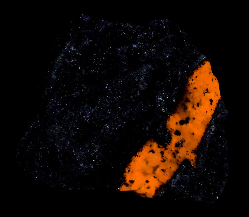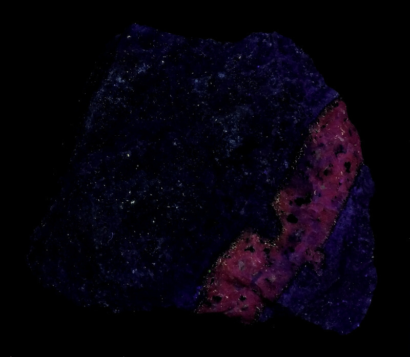 Vein of tenebrescent or photochromic sodalite (hackmanite) in matrix. Under longwave UV light the sodalite fluoresces the typical bright orange; under shortwave the fluorescence is a much dimmer red. Normally white, the sodalite becomes purple upon exposure to UV light, shortwave being more effective. White light will bleach back the sodalite to white.
