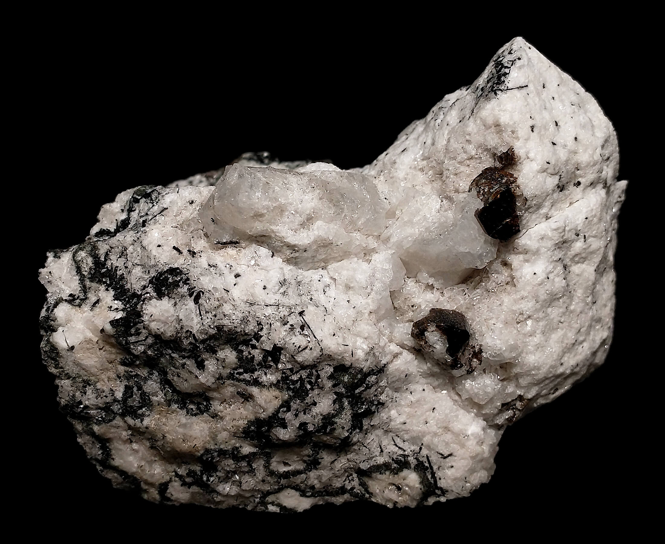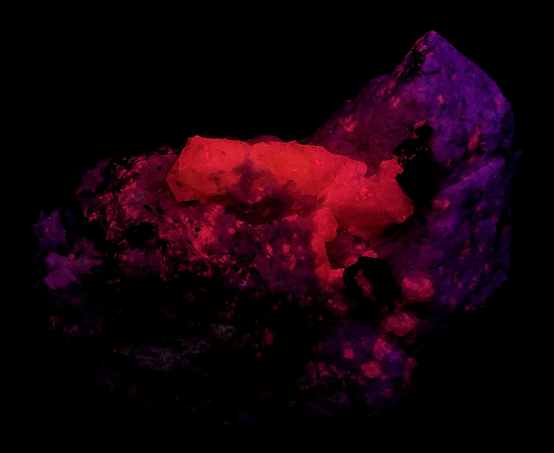 Sodalite crystal (2cm) on matrix. Under longwave UV light the sodalite fluoresces the typical bright orange. Under shortwave instead, it fluoresces an interesting deep red.