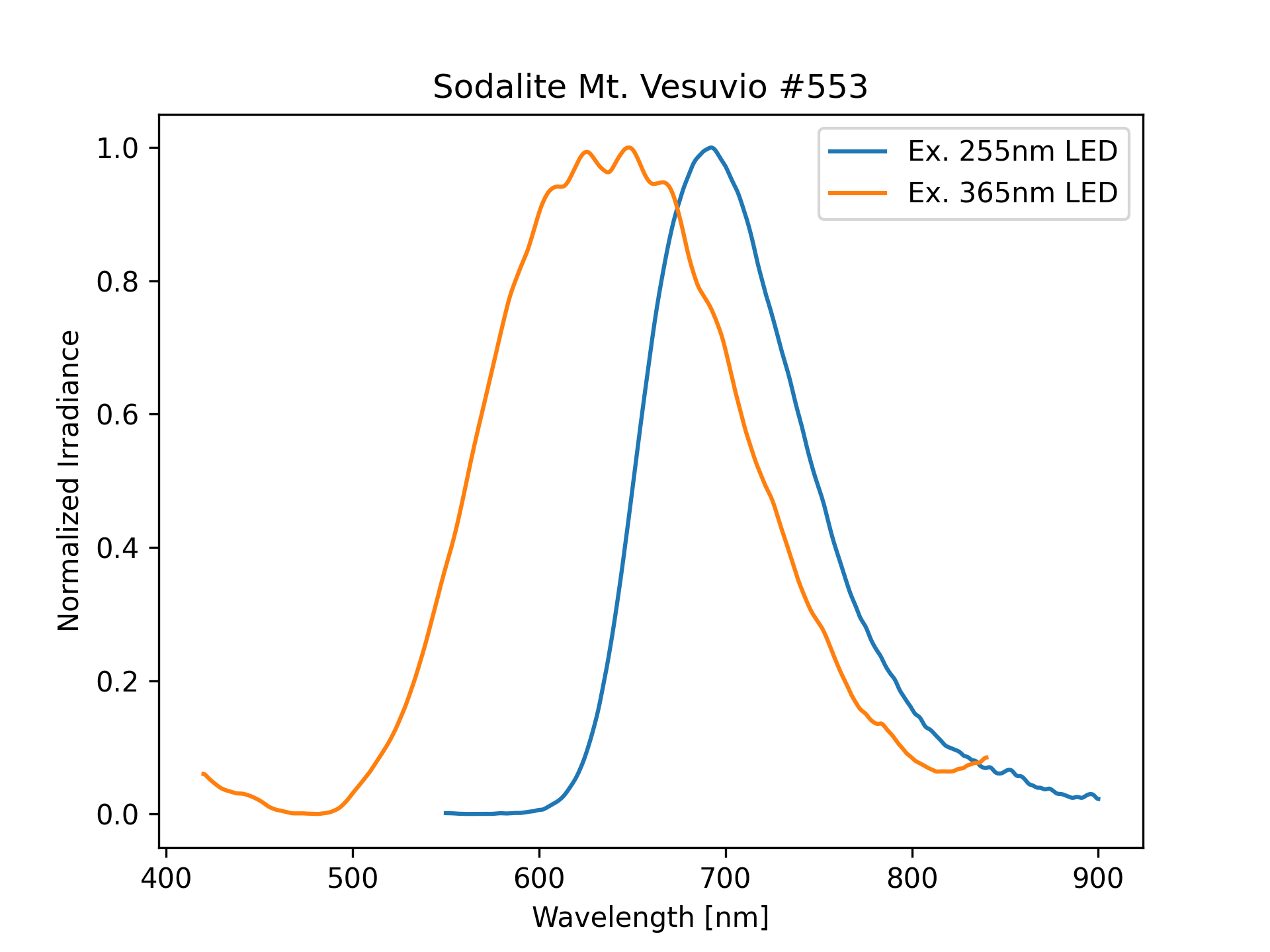Left: Fluorescence under 365nm UVA (longwave) LED. Right: normal light.Comparison between the fluorescence spectra under 255nm UVC LED and 365nm UVA LED excitations.Fluorescence spectrum under 255nm UVC (shortwave) LED excitation.Fluorescence spectrum under 365nm UVA (longwave) LED excitation.Last update: 26 May 2022