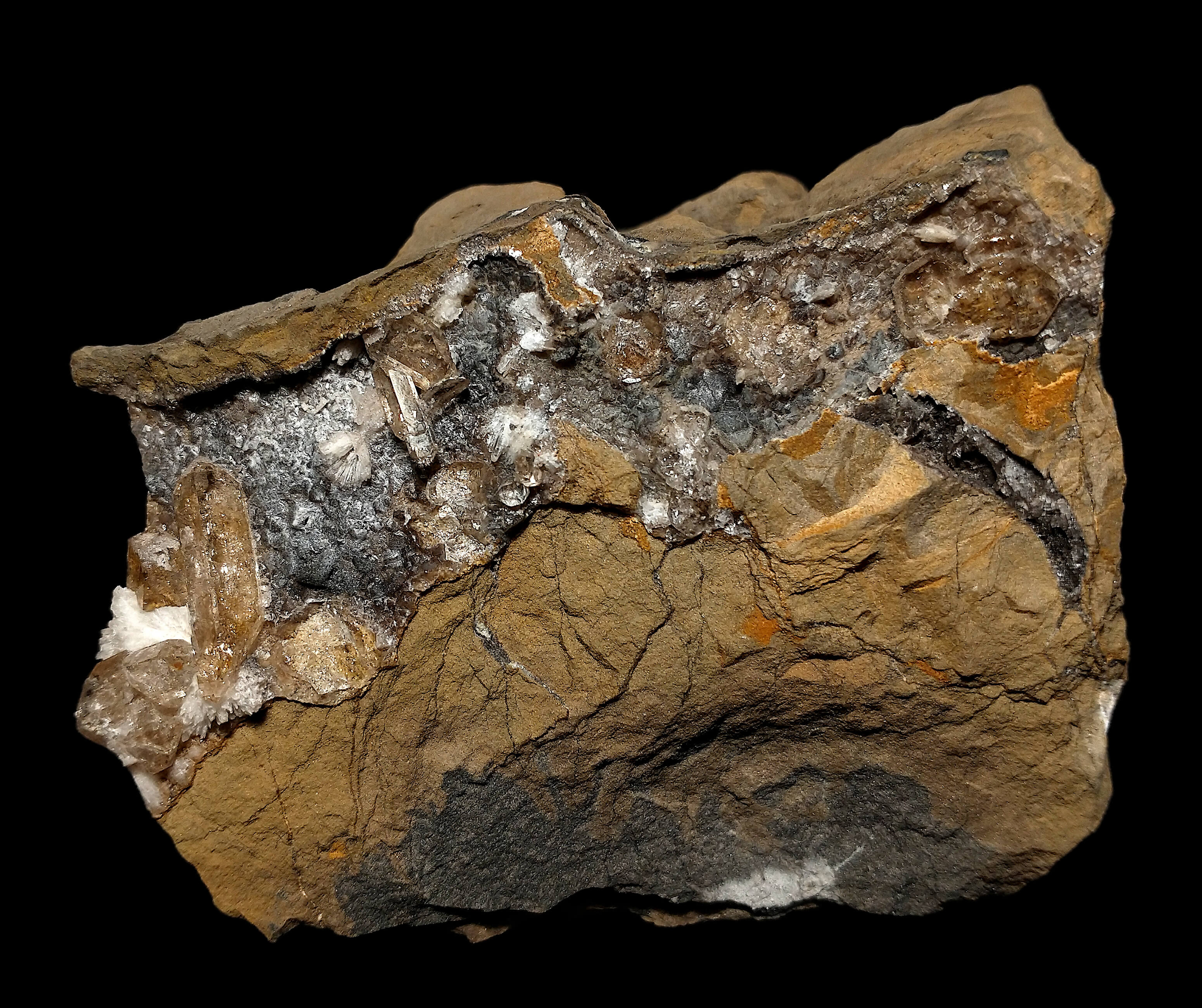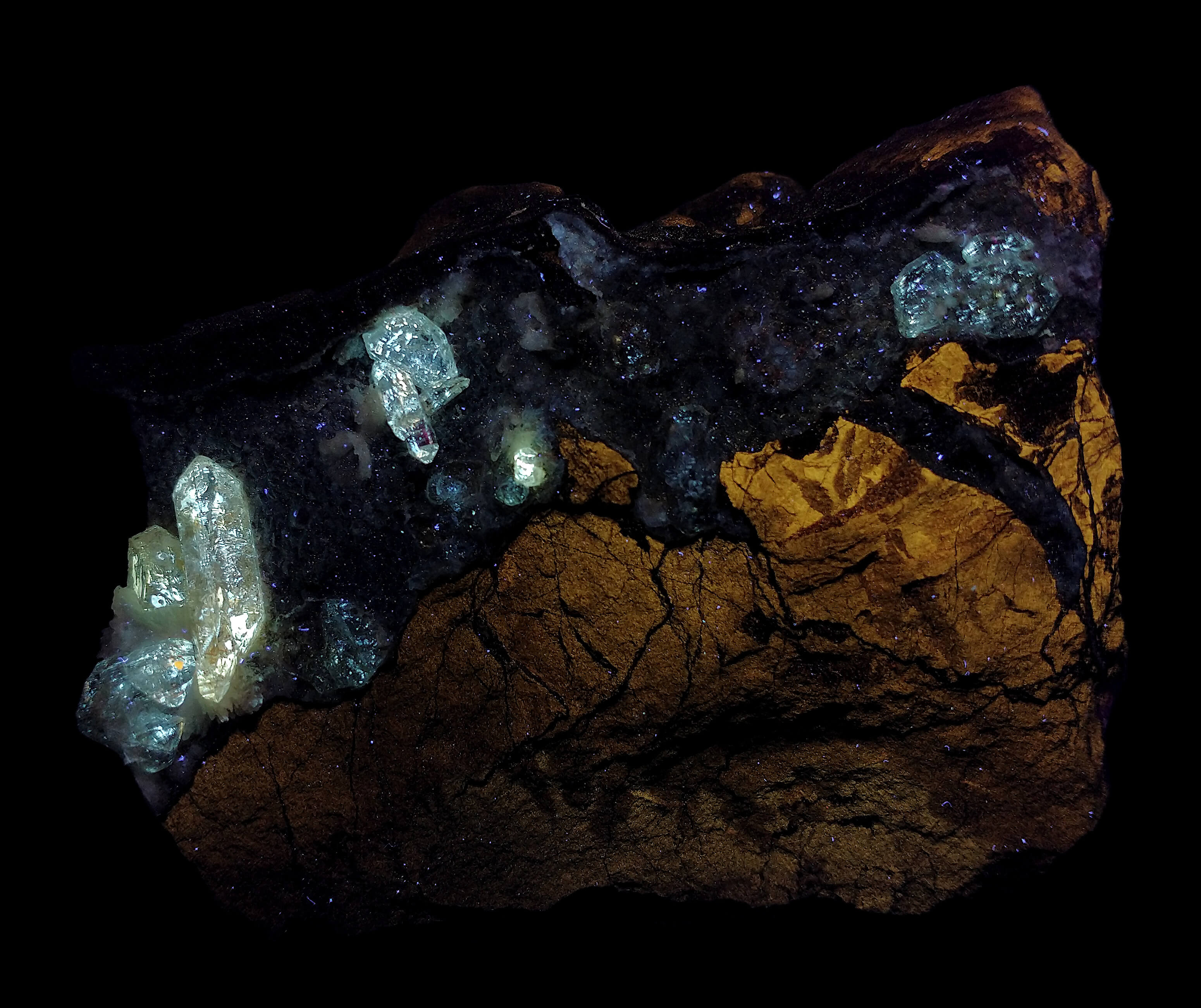 Quartz crystals up to 15mm with hydrocarbons inclusions, fluorescent bright blue under UV light. Possibly from the Torgola Mine.