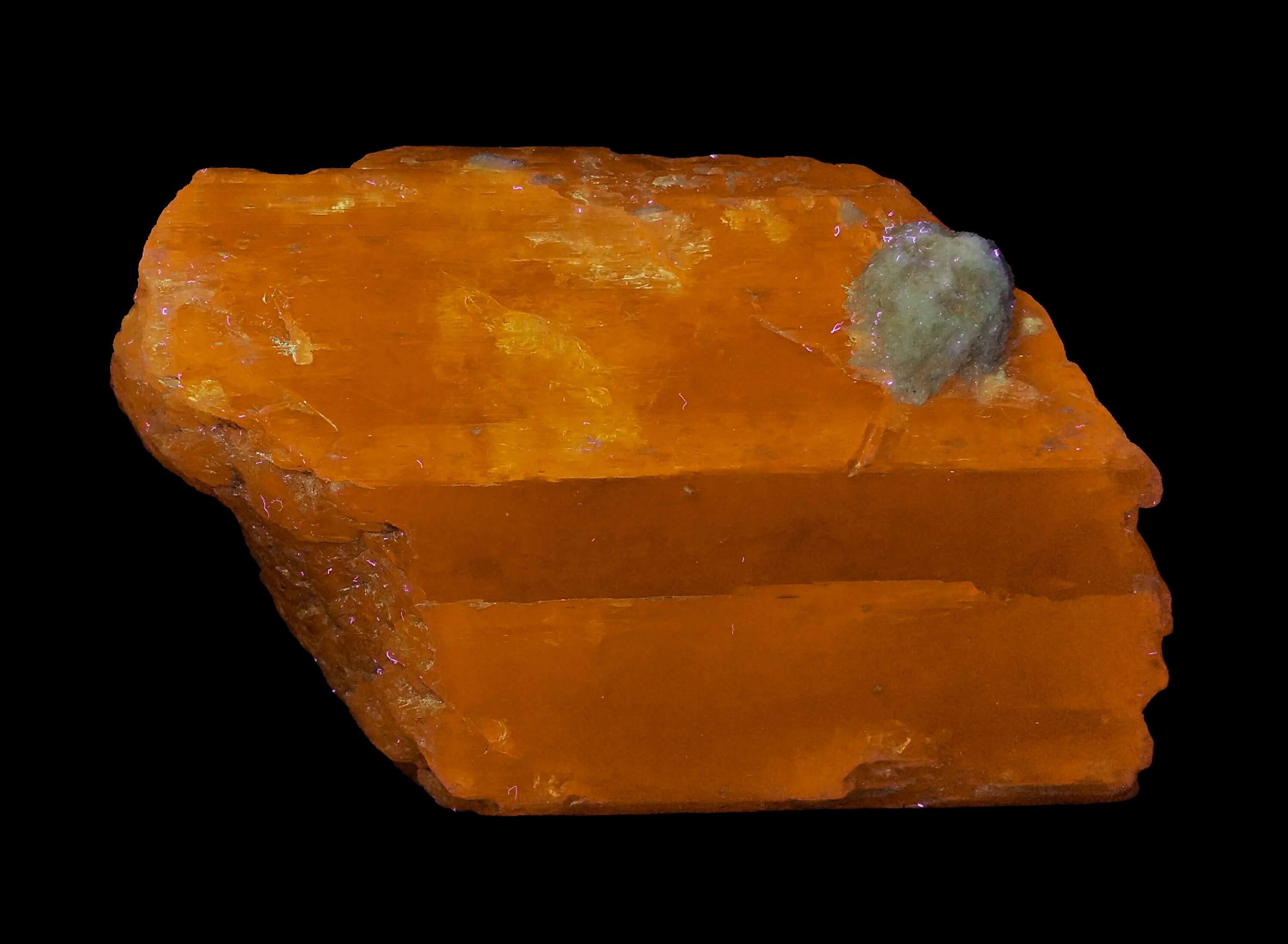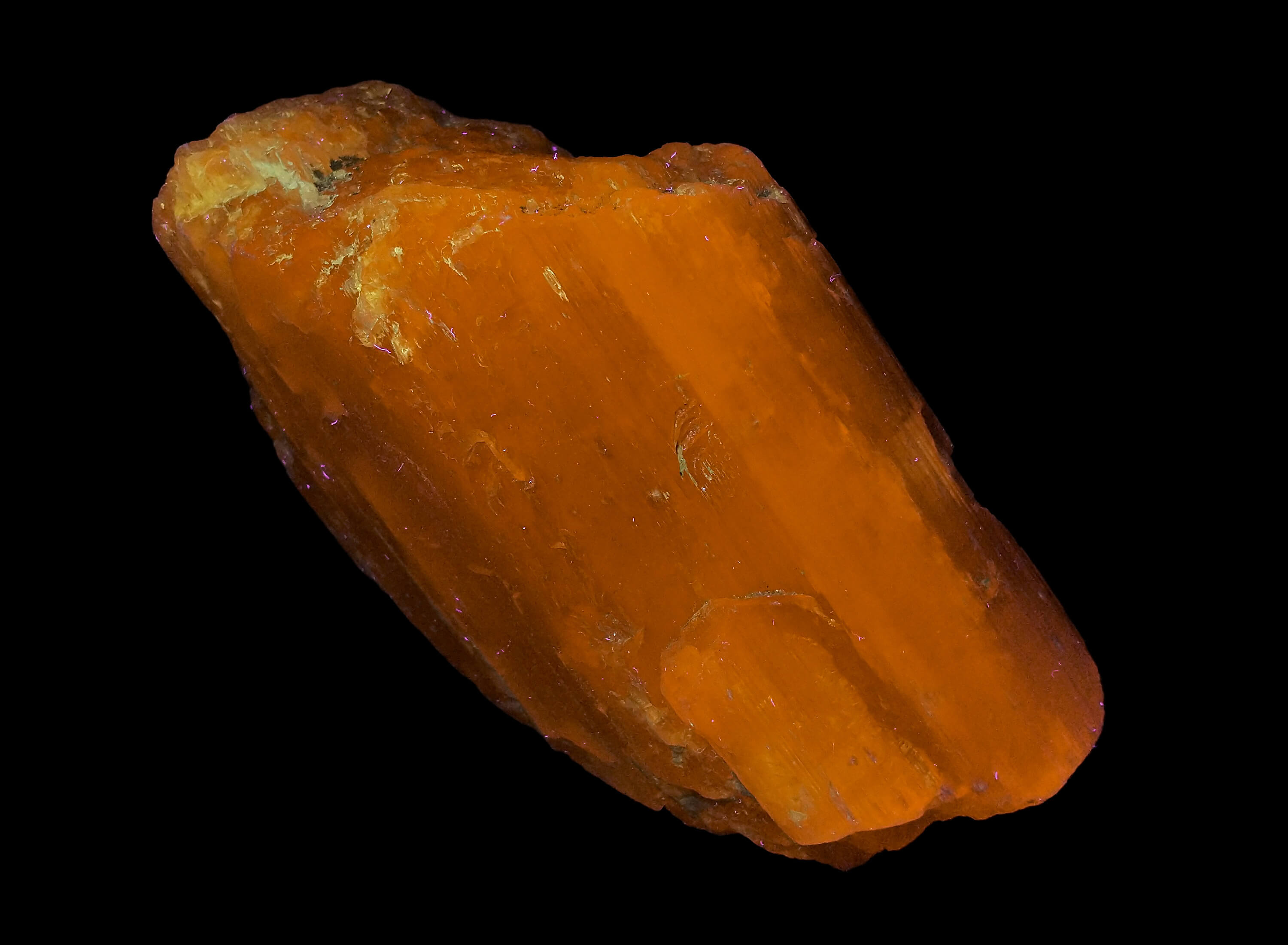Big piece of spodumene, quite gemmy in some parts, with a light pink hue in daylight. Fluorescent orange under longwave UV light. Nothing interesting under shortwave or midwave UV.