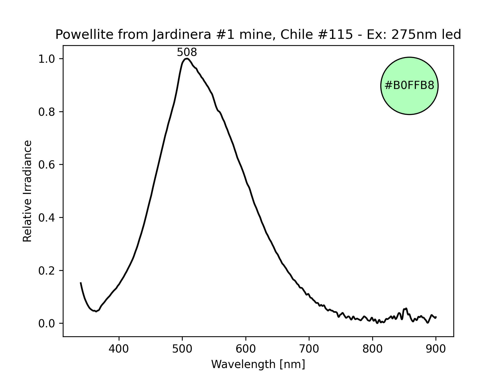 | Powellite (#115) | Jardinera No. 1 Mine, Inca de Oro mining district, Chile | 275nm LED | MoO42- | |