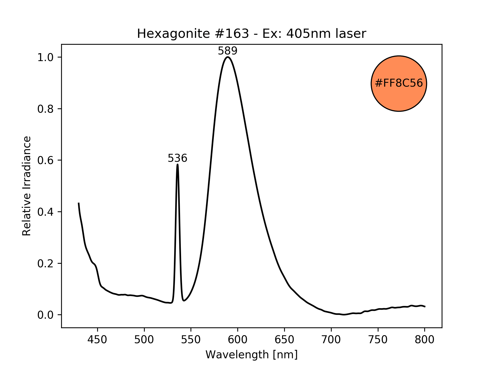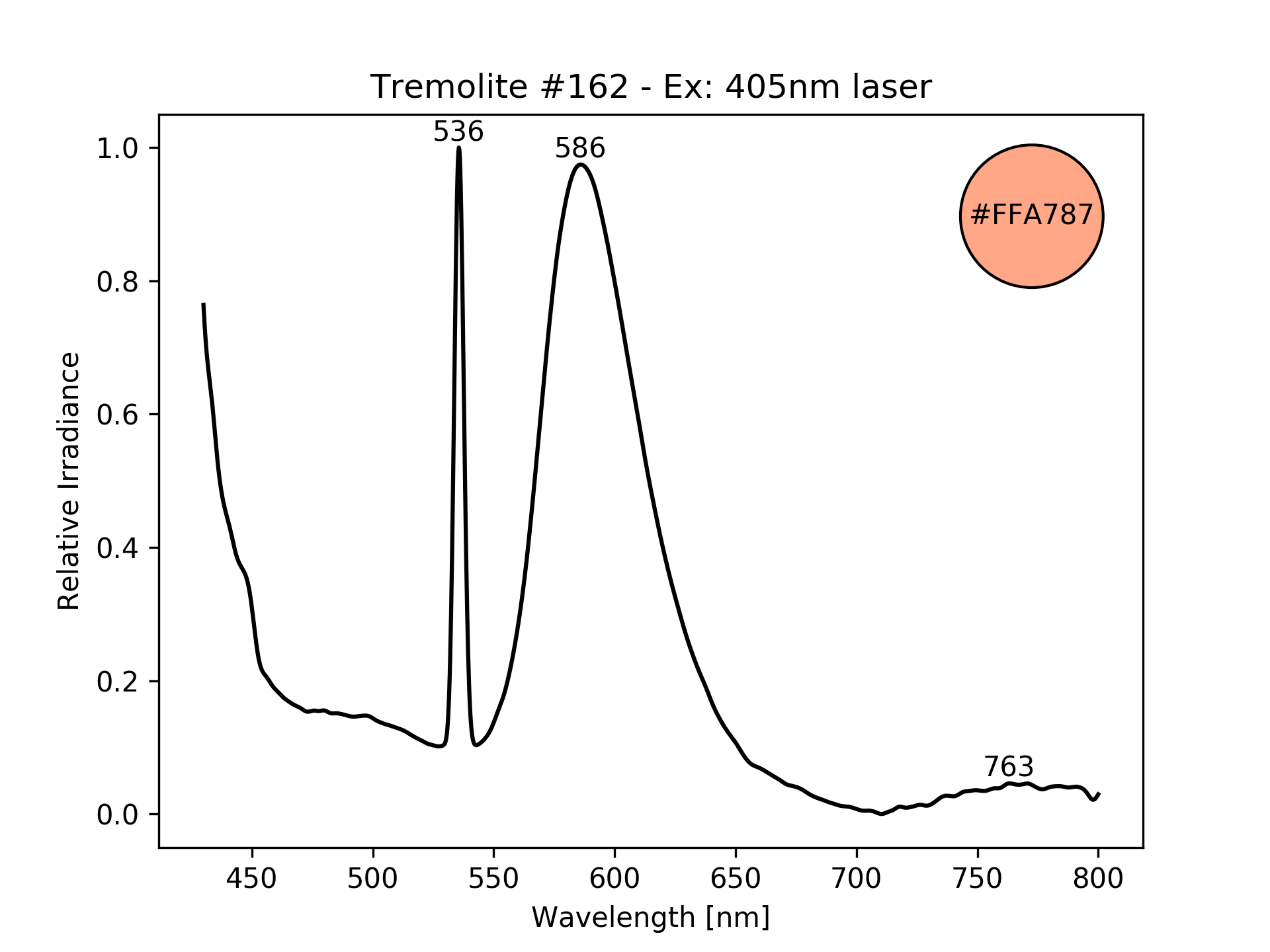 | Tremolite (#162) | Talcville, New York, USA | 405nm Laser | Mn2+ | |