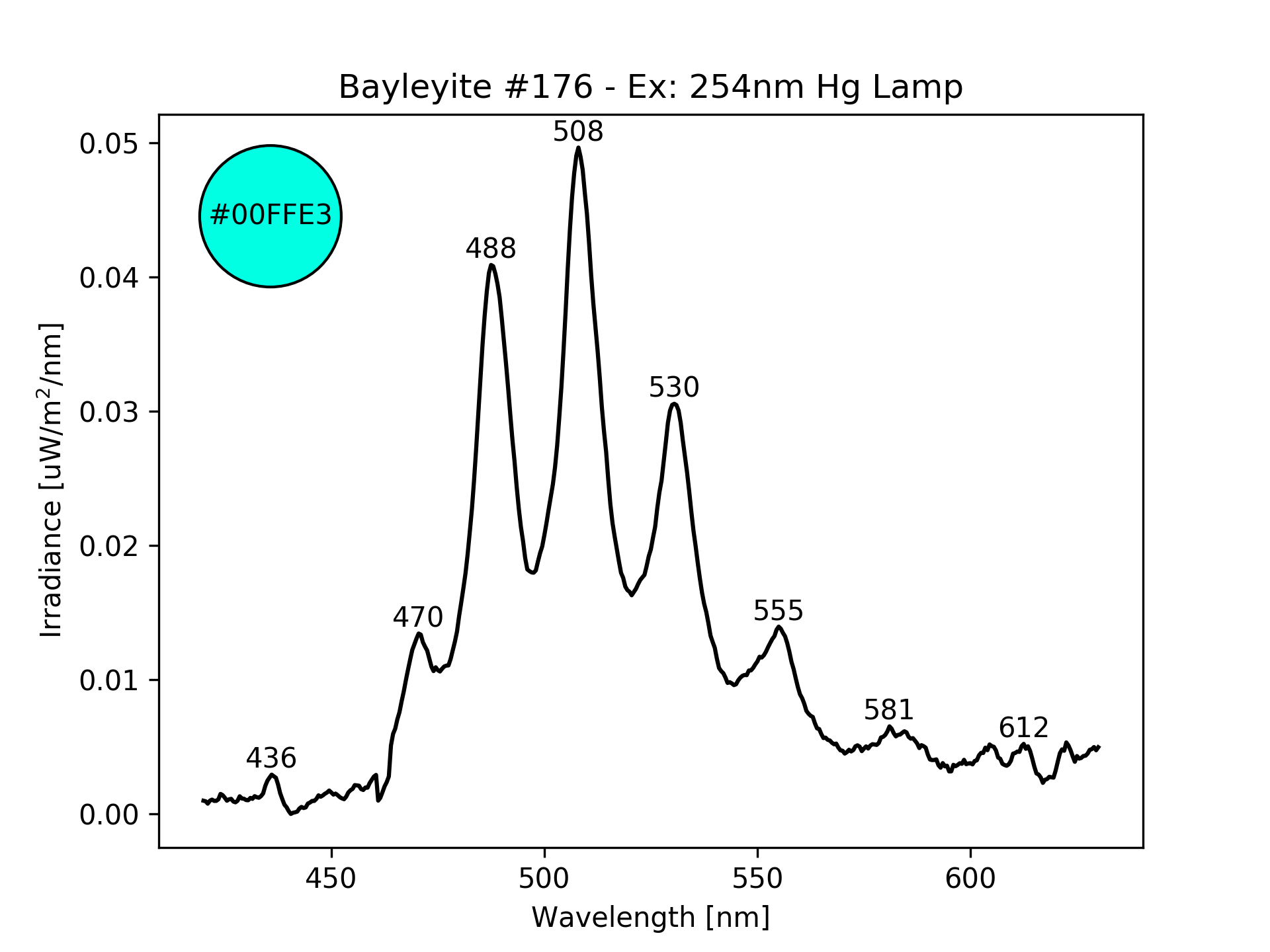 | Bayleyite (#176) | Hideout Mine, Utah, USA | 254nm Hg | UO22+ | |