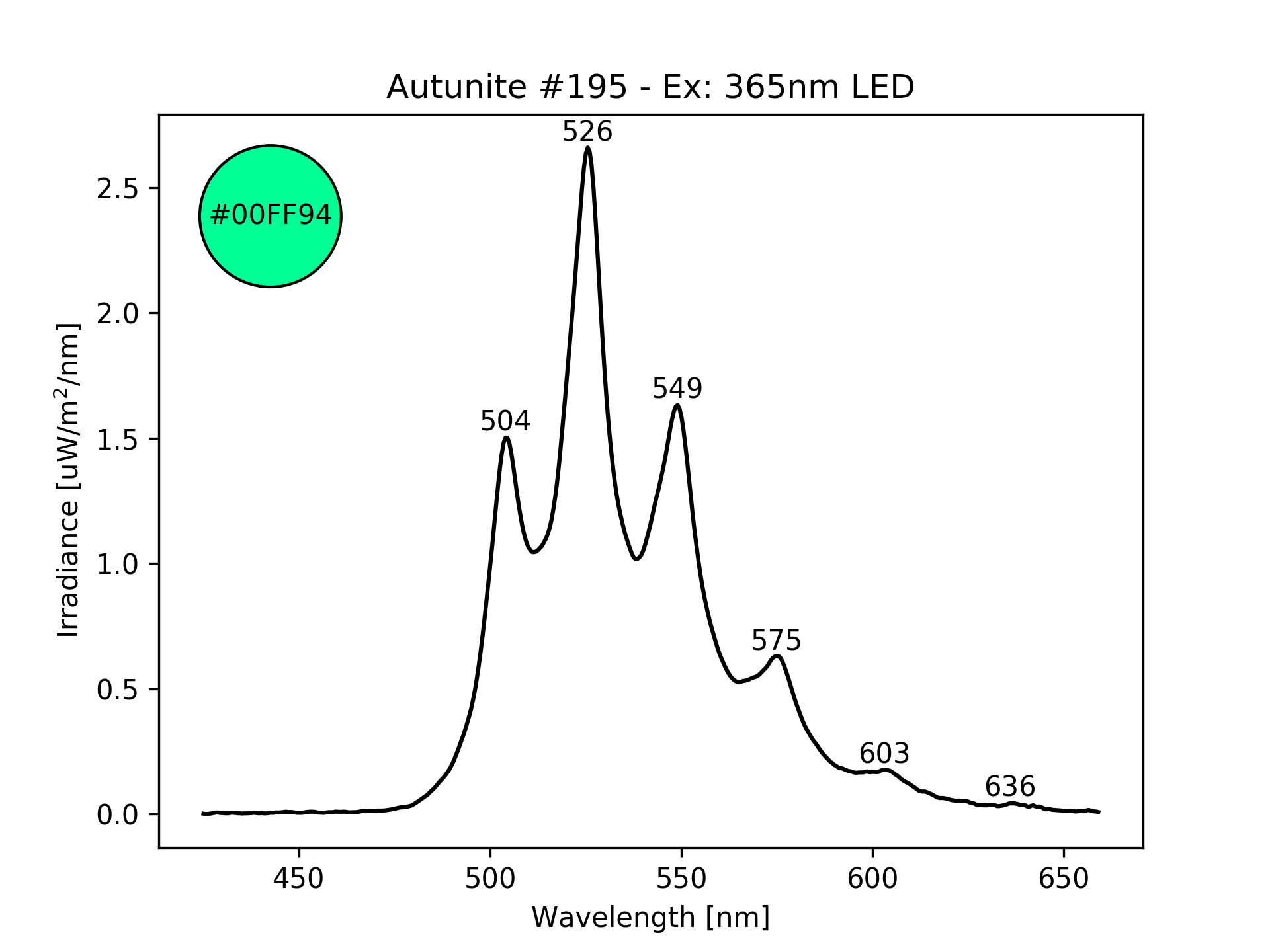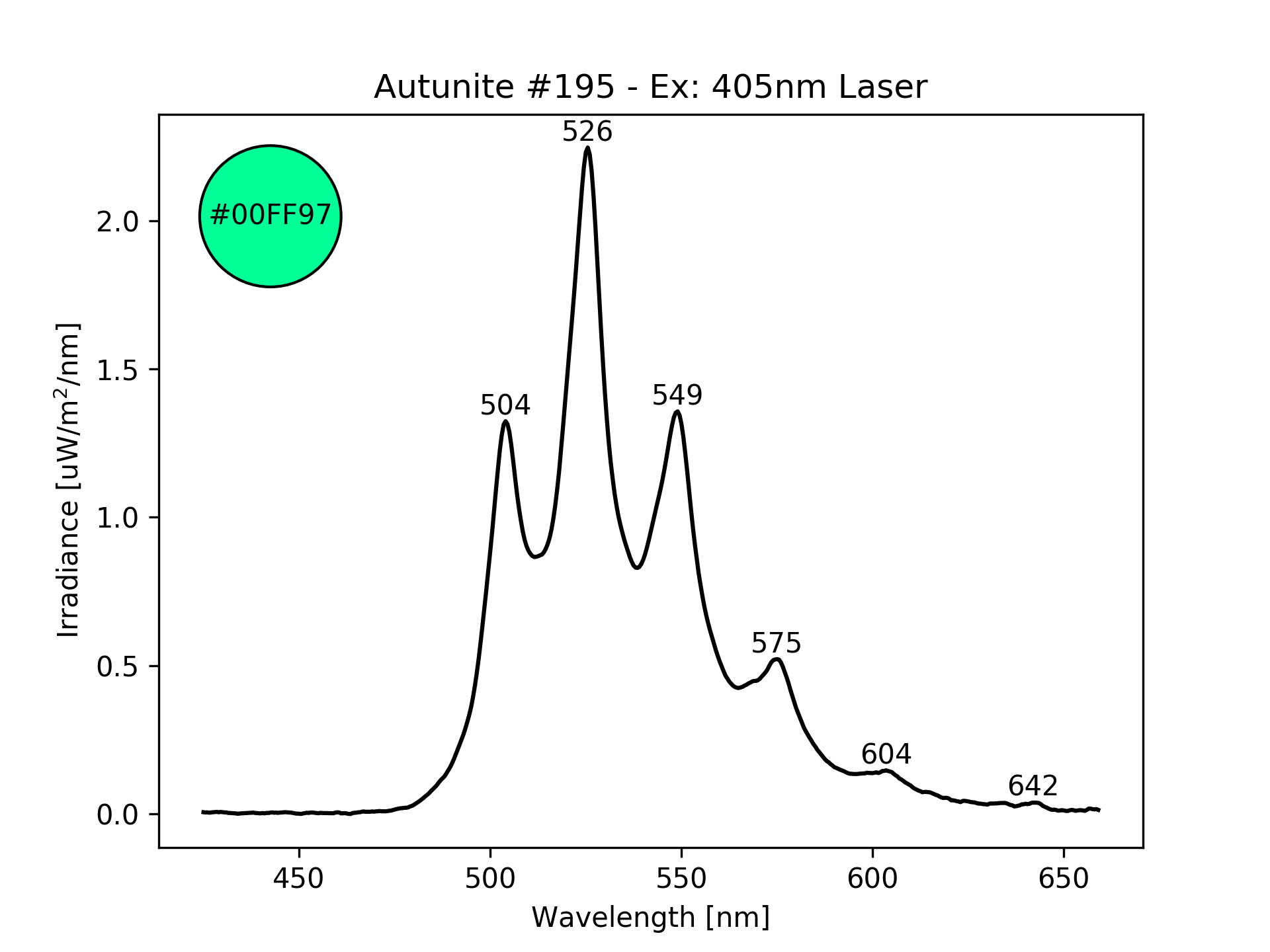 | Autunite (#195) | Streuberg Quarry, Saxony, Germany | 405nm Laser | UO22+ | |