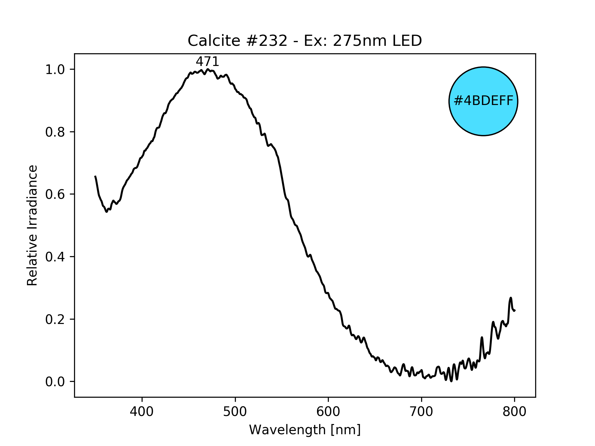 | Calcite (#232) | Citrus Co., Florida, USA | 275nm LED | Organic? | |