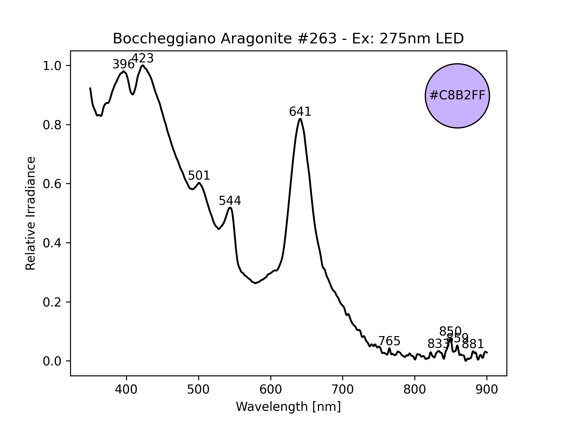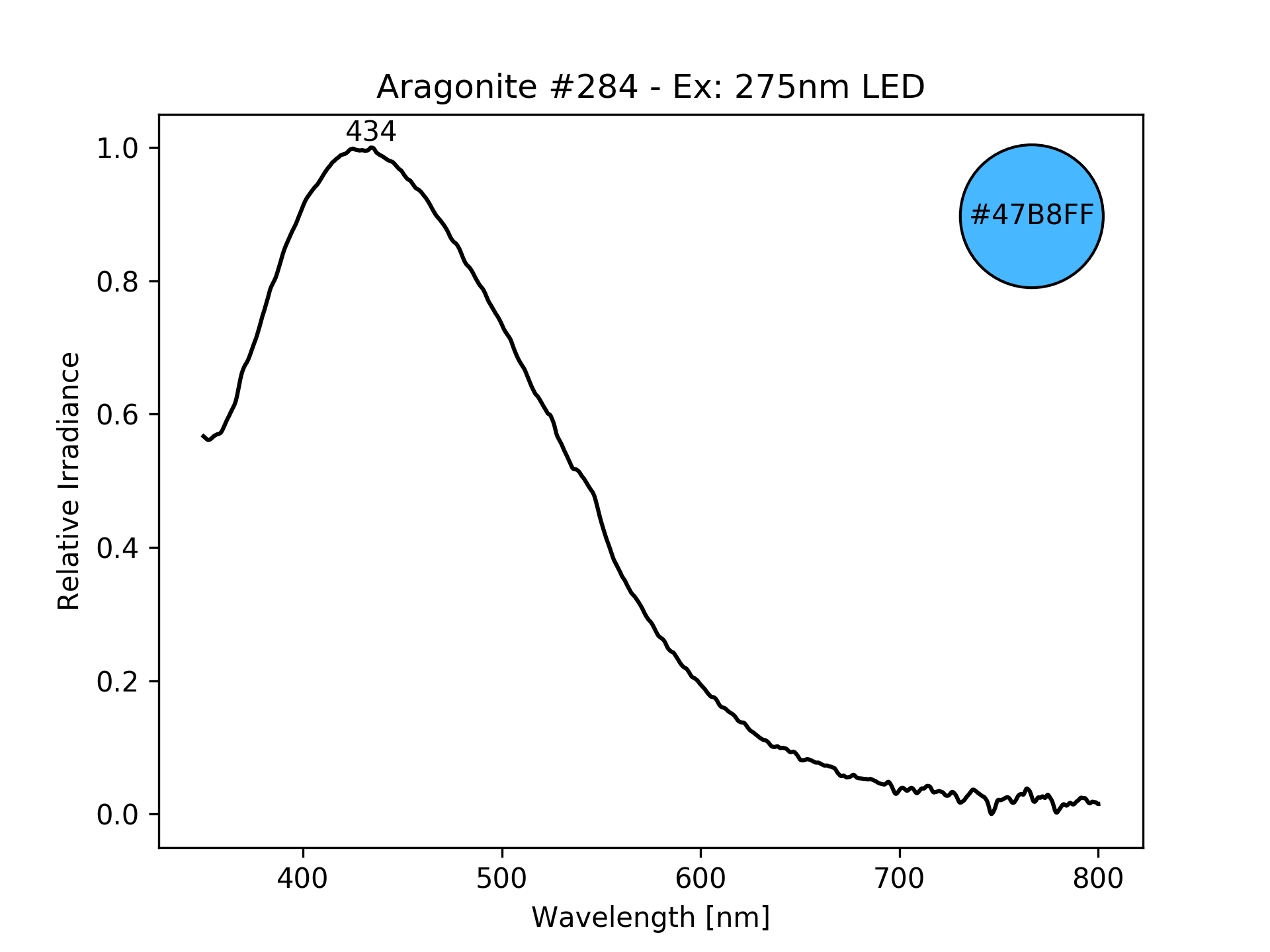 | Aragonite (#263) | Boccheggiano Mines, Tuscany, Italy | 275nm LED | Sm3+, Humic-acid | |