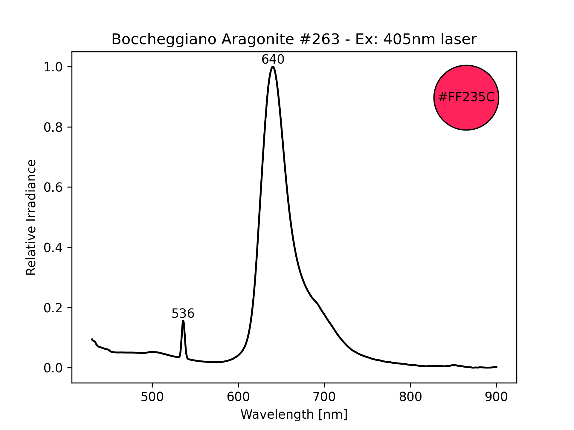 | Aragonite (#263) | Boccheggiano Mines, Tuscany, Italy | 405nm Laser | Sm3+ | |