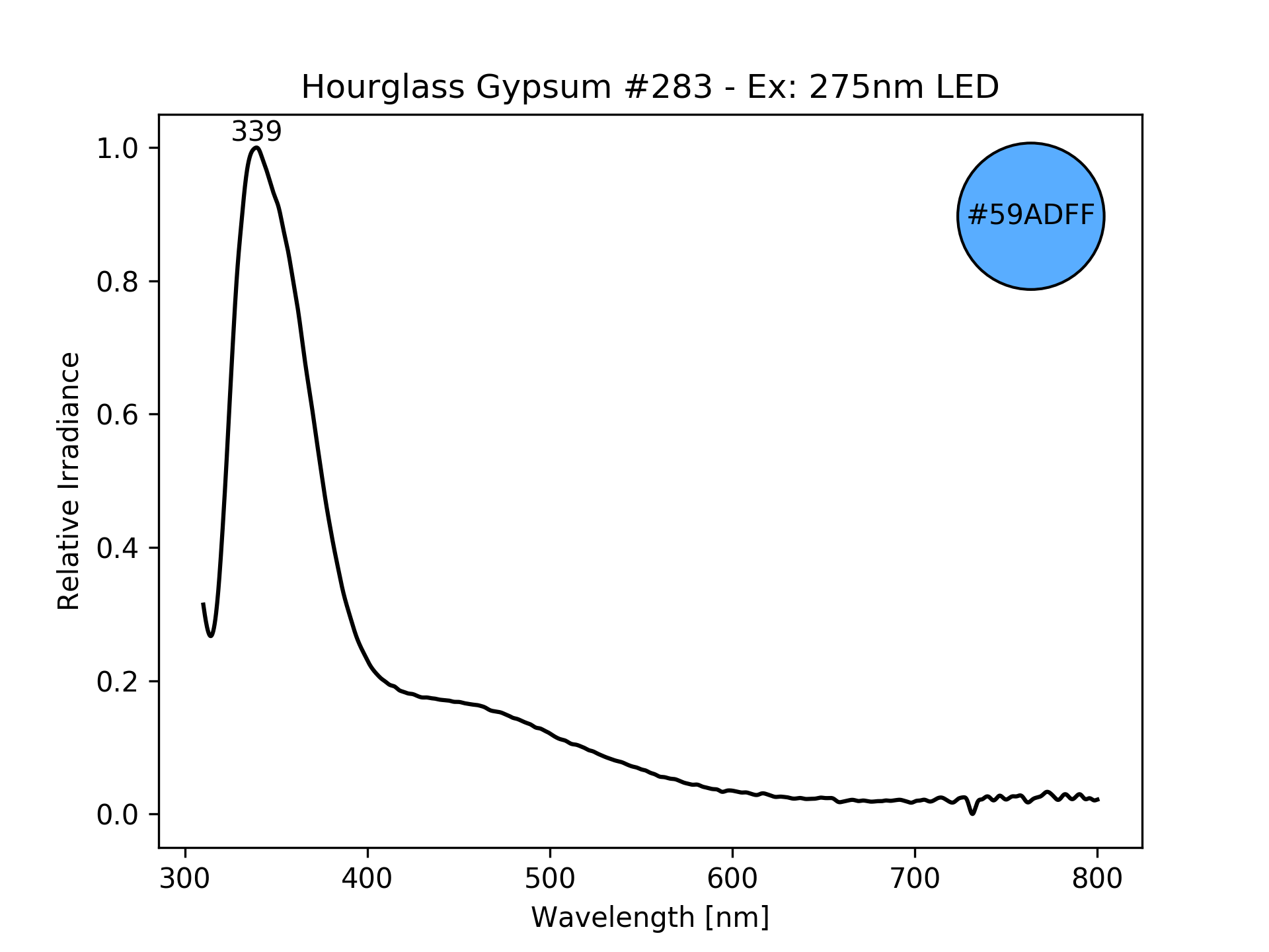 | Hourglass Gypsum (#283) | Chodziez County, Greater Poland Voivodeship, Poland | 275nm LED | ?? | |