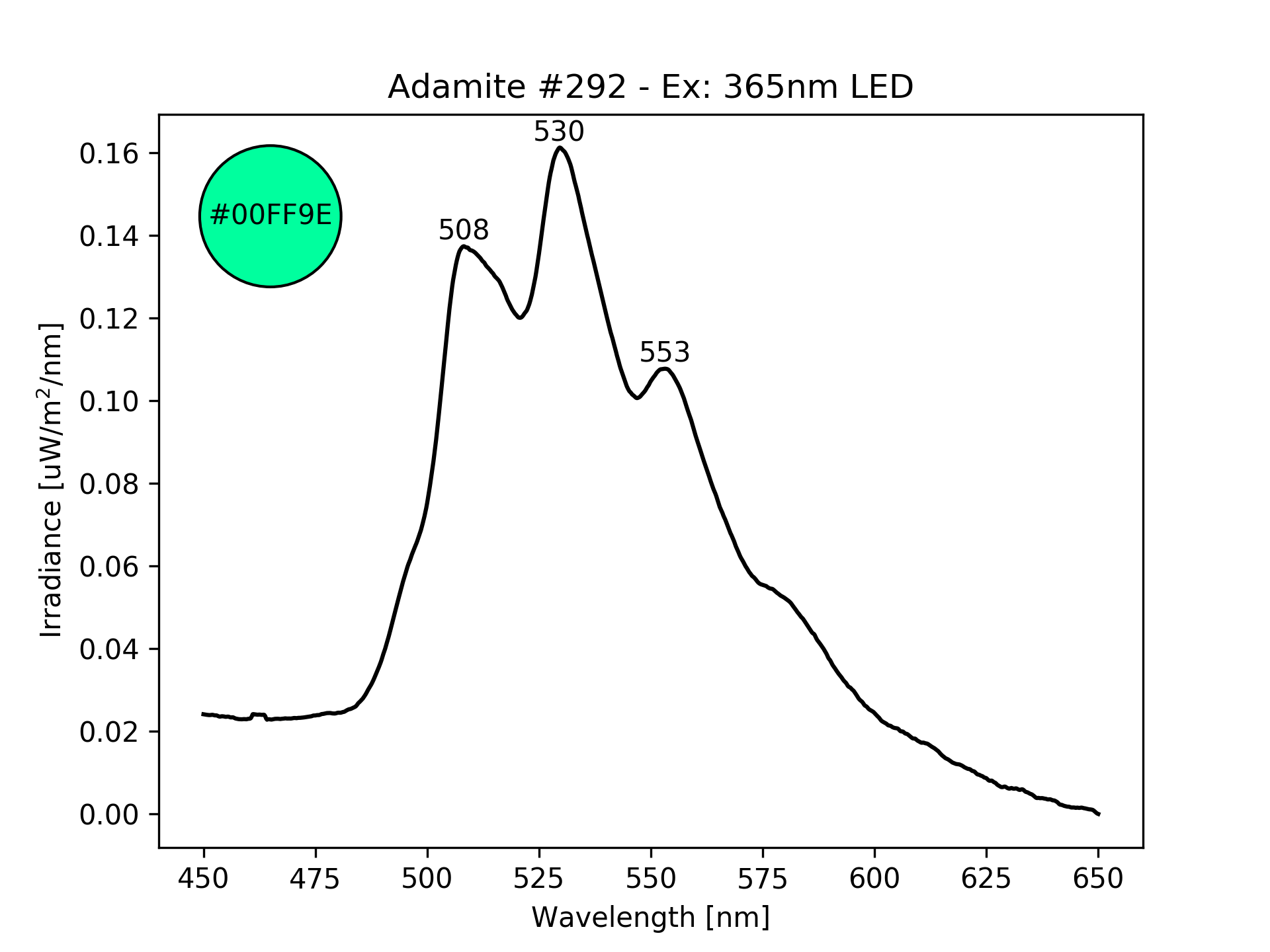 | Adamite (#292) | Ojuela Mine, Mapimí, Durango, Mexico | 365nm LED | UO22+ | |