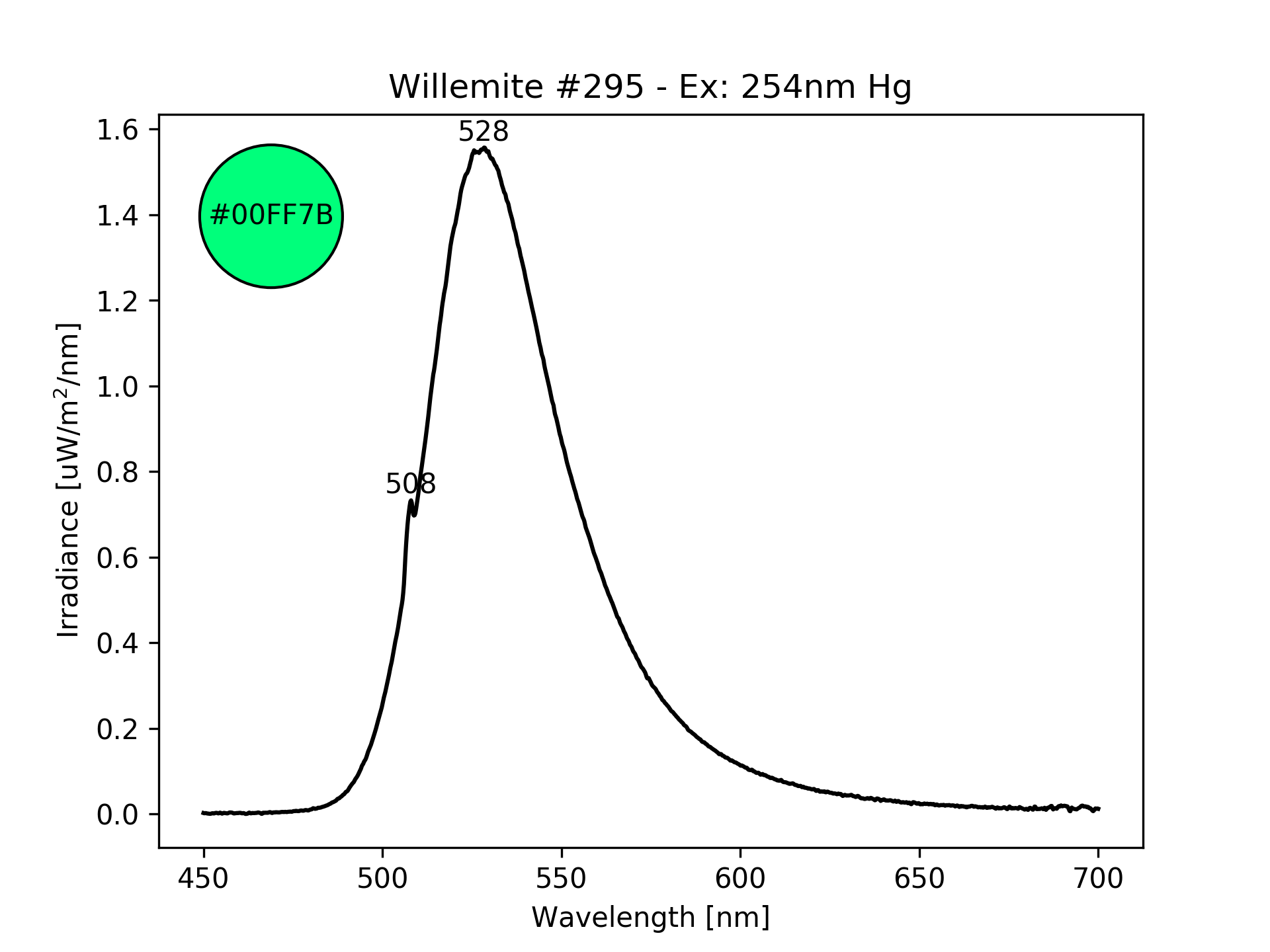 | Willemite (#295) | Franklin Mine, New Jersey, USA | 254nm Hg | Mn2+ | |
