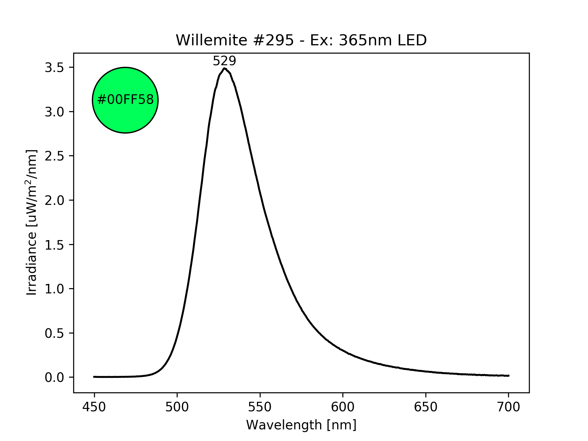 | Willemite (#295) | Franklin Mine, New Jersey, USA | 365nm LED | Mn2+ | |