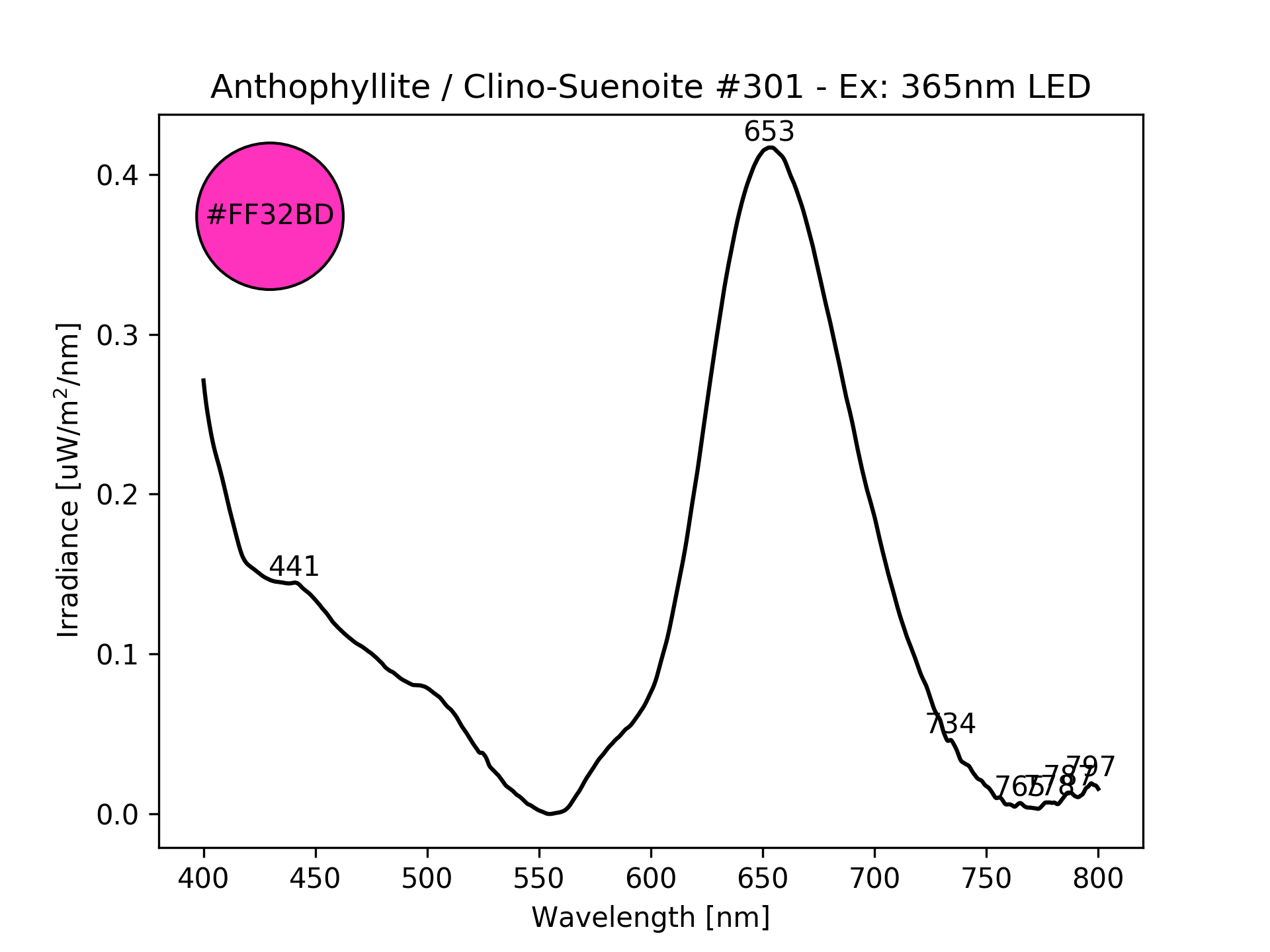 | Tremolite var Hexagonite (#163) | Talcville, New York, USA | 405nm Laser | Mn2+ | |