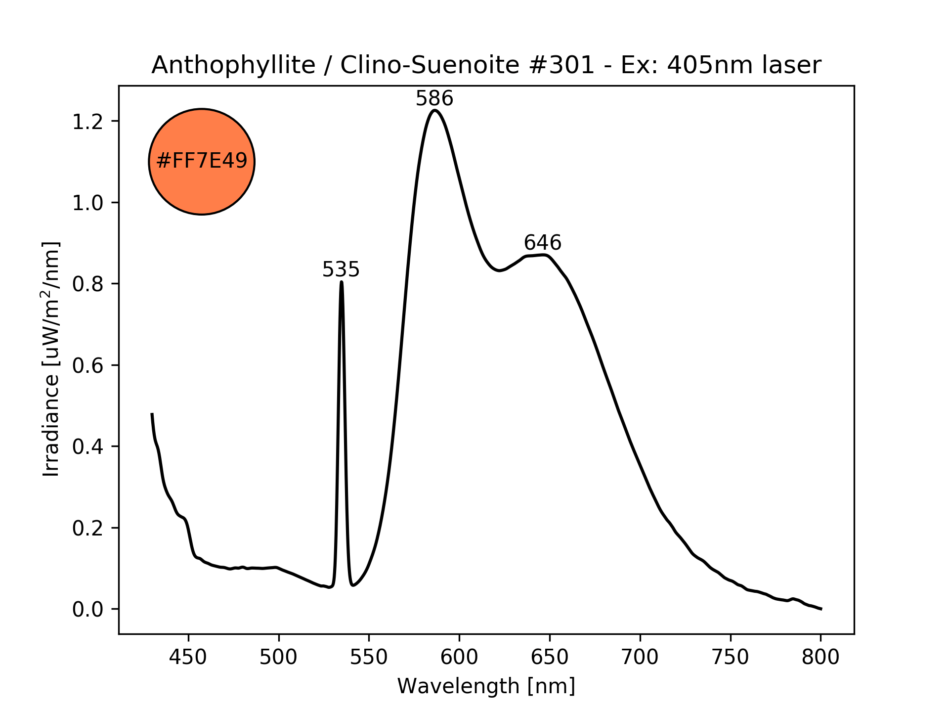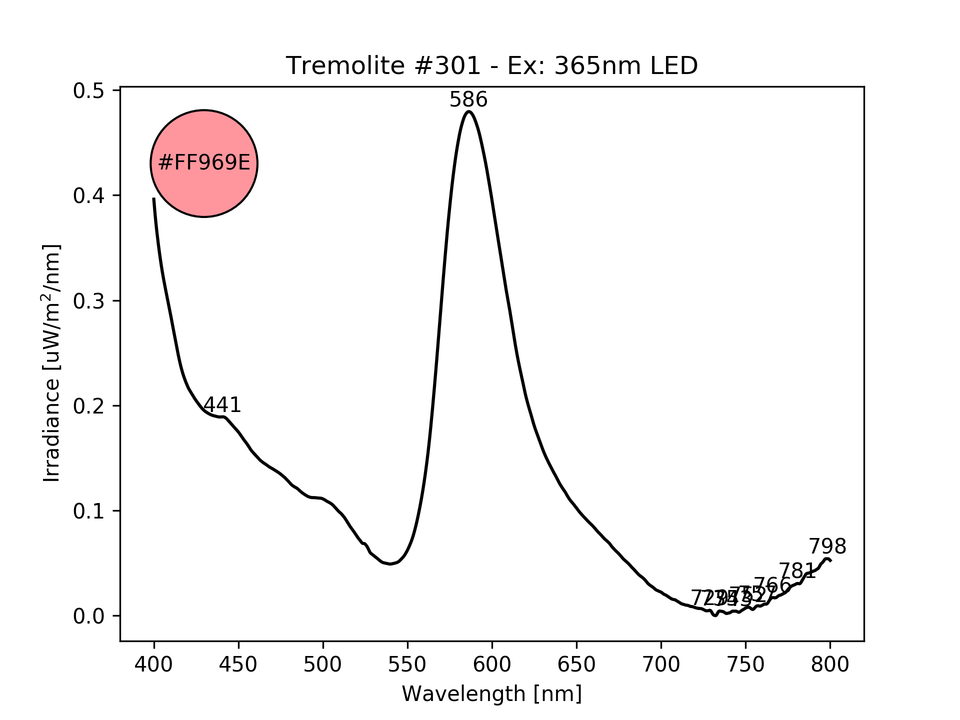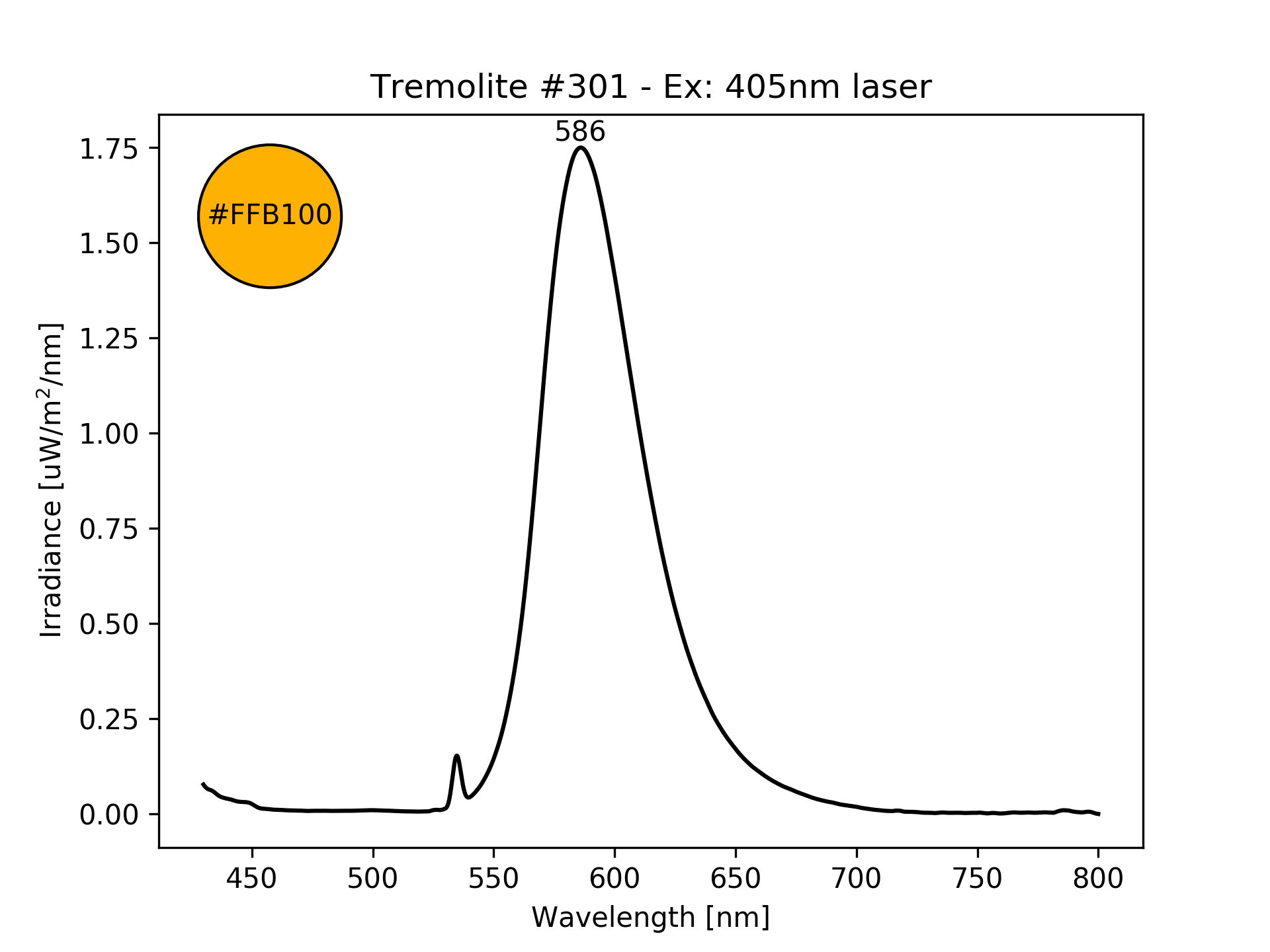 | Tremolite (#301) | Talcville, New York, USA | 405nm Laser | Mn2+ | |